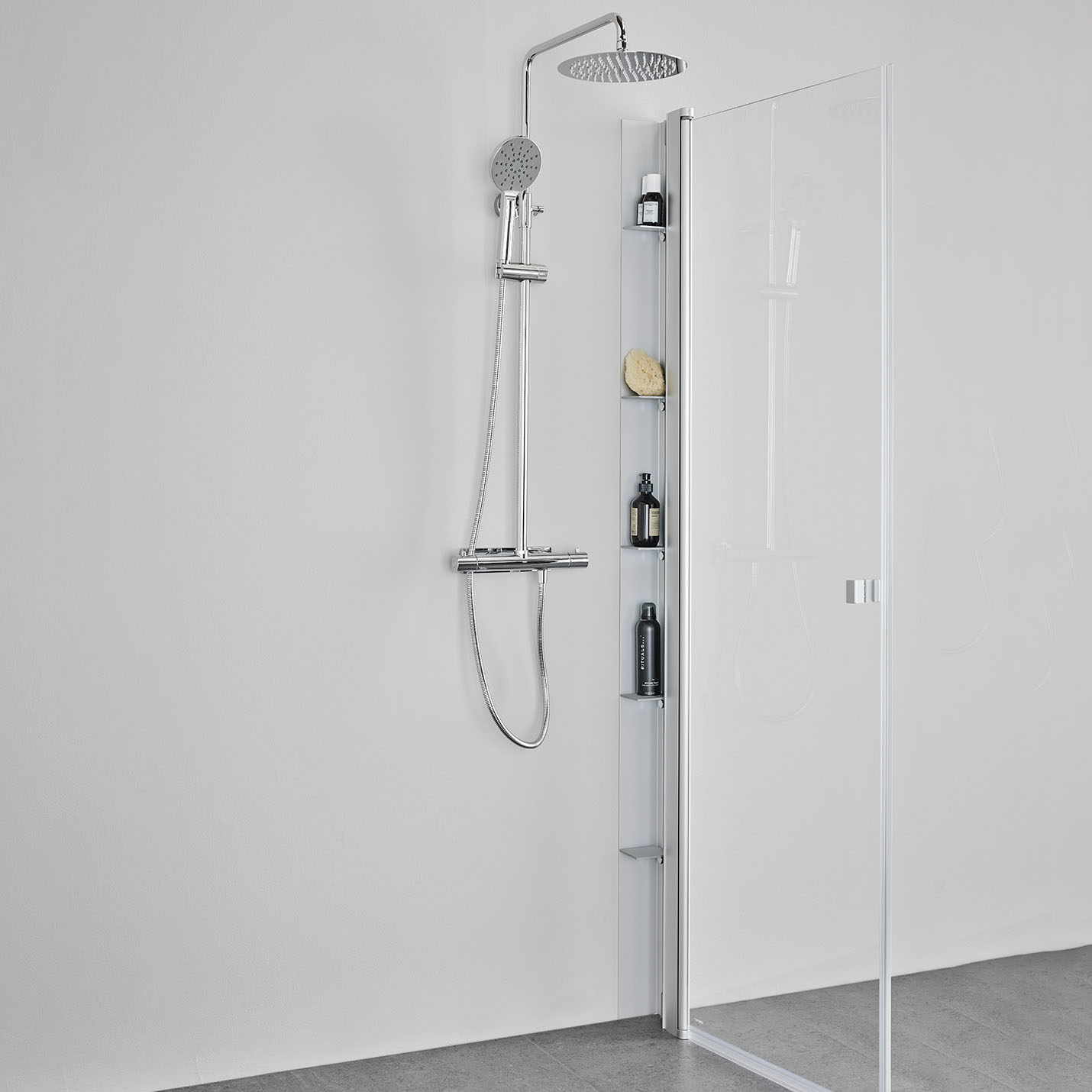 Duschhylla Place skapar mycket förvaring i duschen för alla flaskor och prylar samtidigt som den skapar visuell harmoni genom att hålla dem utom synhåll – smidigt och snyggt. I duschhyllan finns 5 hyllplan, vilka kan justeras i höjdled. Place monteras mellan vägg och duschvägg eller duschdörr och är 100 mm bred. Det vill säga, om du i ditt badrum skall ha en 90x90 cm duschlösning inklusive Place duschhylla, skall du beställa en 90x80 duschlösning där sidan som är 80cm är den där Place duschhylla monteras.