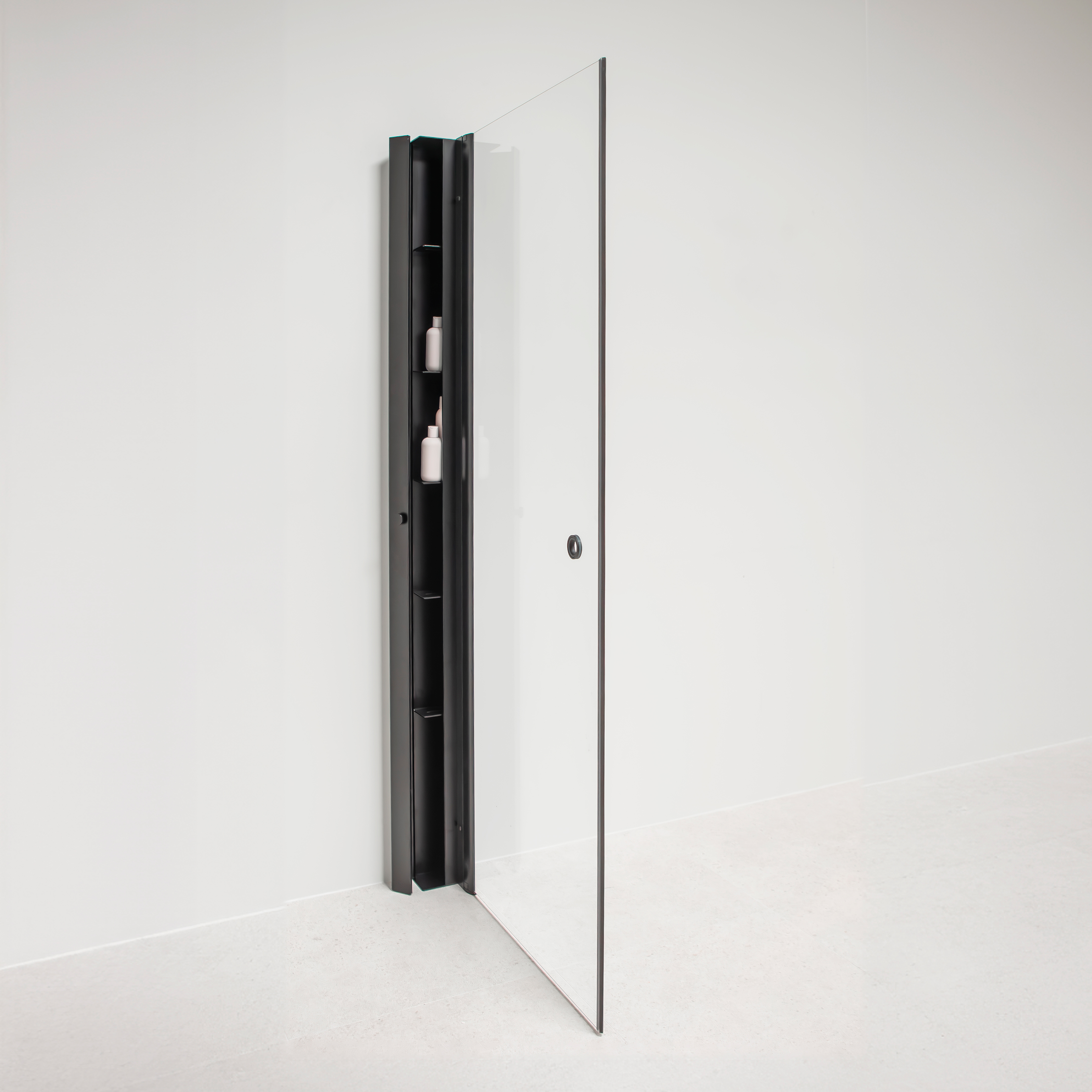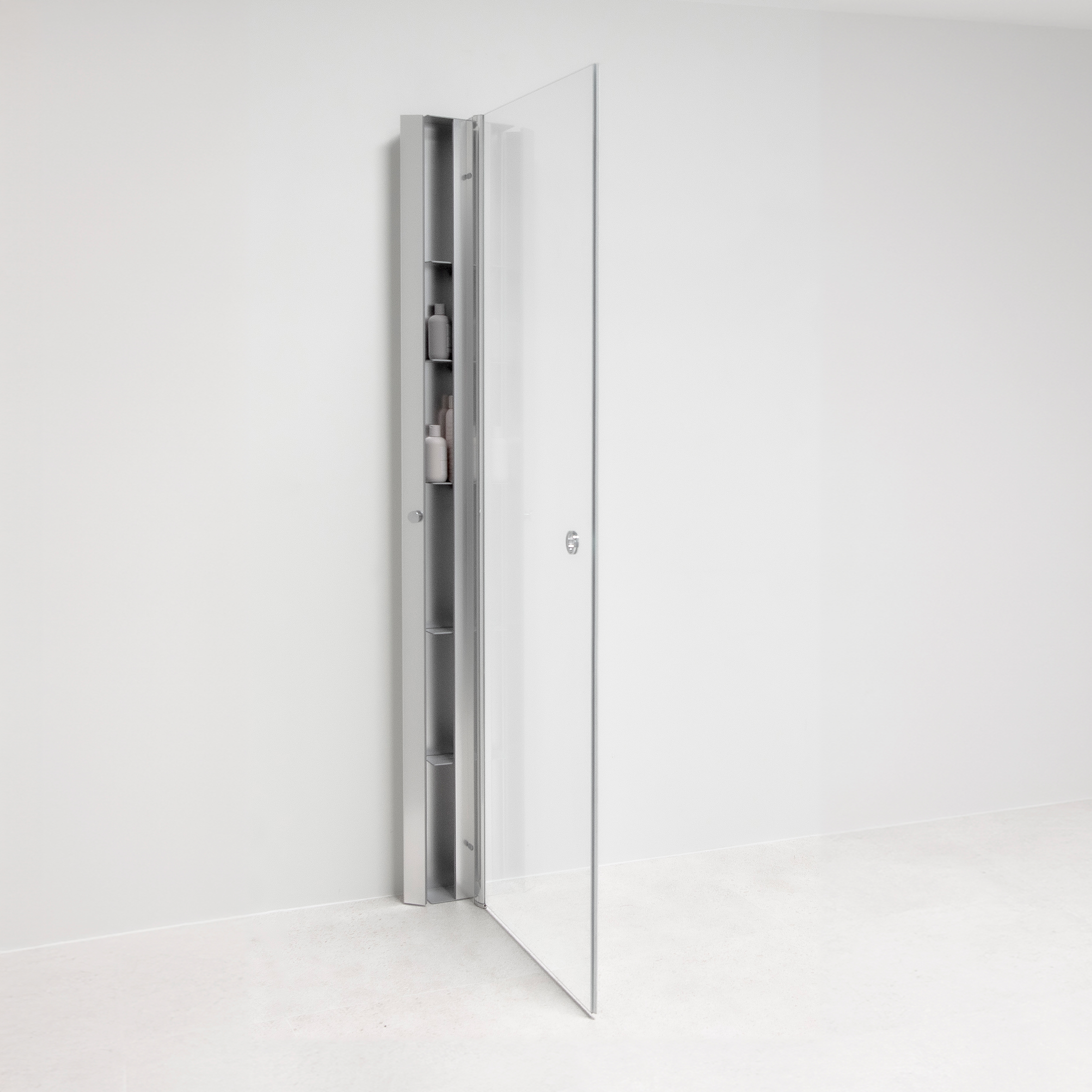 Duschhylla Macro Design Sky är en diskret duschhylla som gömmer och skyddar dina badrumstillbehör bakom en elegant dörr.