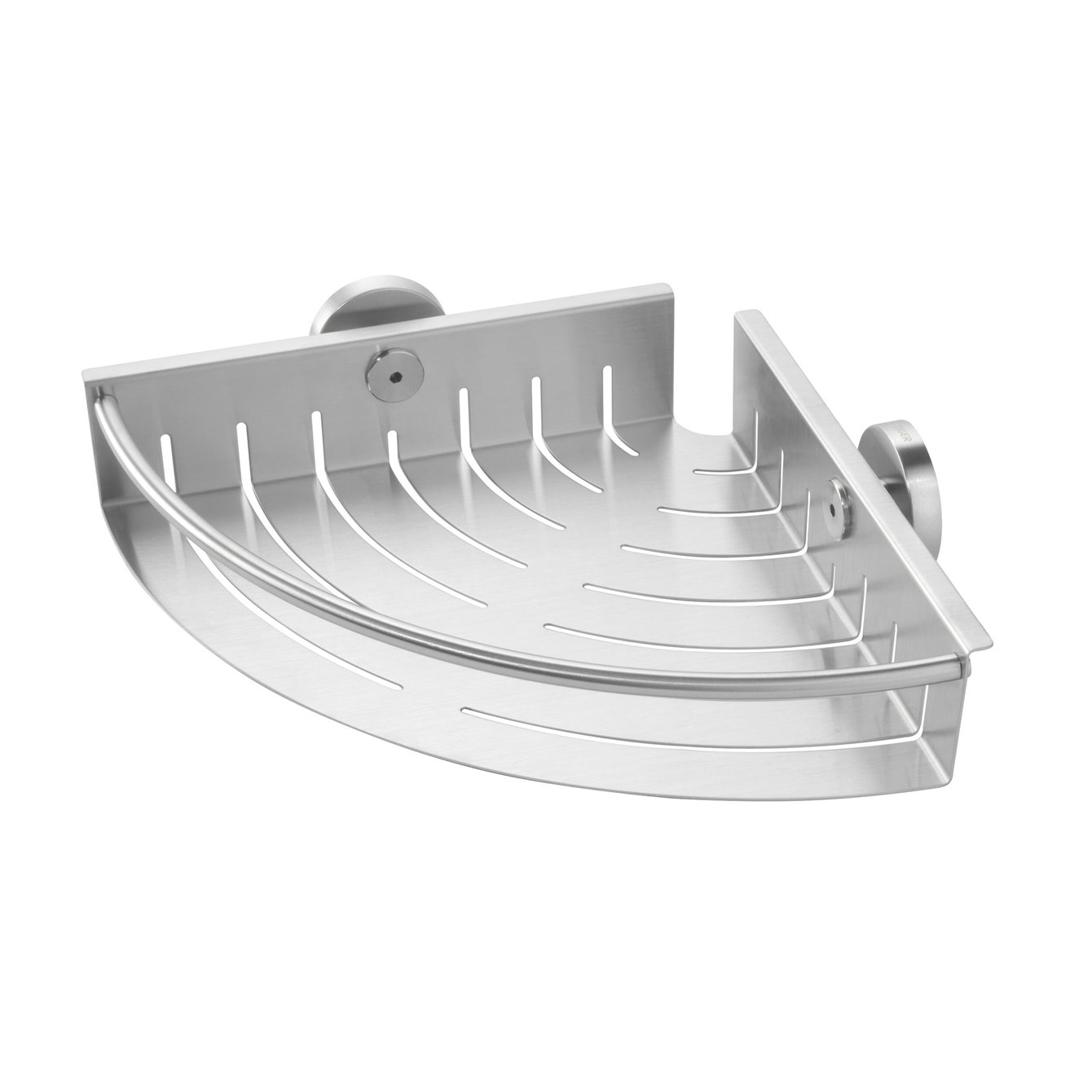 Duschhylla Tiger Boston i rostfritt stål för hörnmontage. Duschhyllan kan monteras med medföljande skruv eller Tigerfix 1 lim som köps separat.