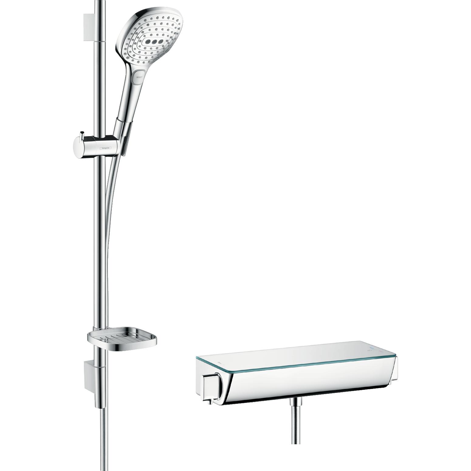 Raindance Select E 120 är ett duschset från Hansgrohe som består av duschtermostat, handdusch, duschstång, glidfäste och tvålkopp.