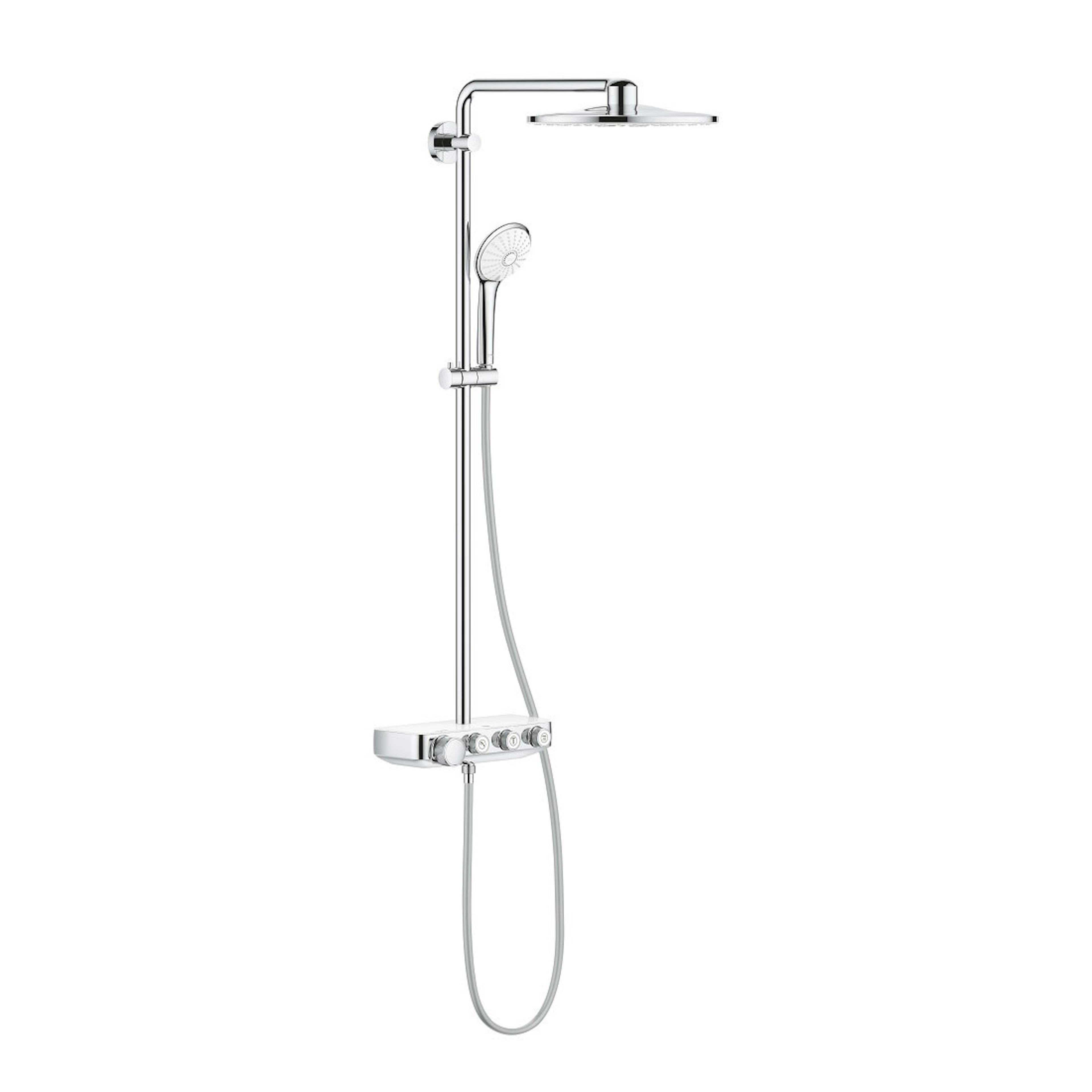 Takduschset Grohe Euphoria SmartControl System 310 Duo 26507 har en stilren och exklusiv design samt moderna funktioner. Njut av en härlig duschupplevelse varje gång du kliver in under den Ø310 mm stora duschhuvuudet som erbjuder olika stråltyper. Termostatblandaren har även en liten avställningsyta som passar perfekt för exempelvis schampoflaskan. Utrustad med antikalksystemet SpeedClean och energi- och vattenbesparande funktionen EcoJoy. Finns att köpa i olika färger.