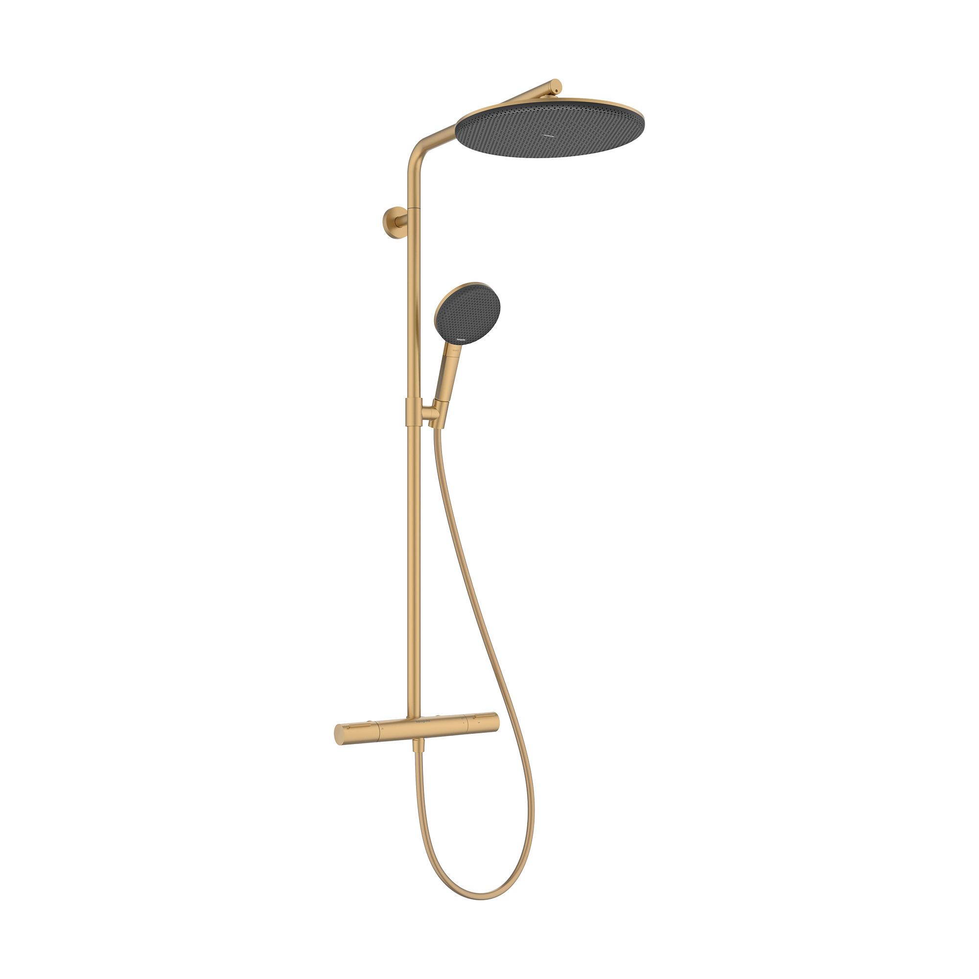 Takduschset Hansgrohe Raindance Alive S Puro Showerpipe 300 1jet är tillverkad i mässing och ABS-plast och är ett komplett takduschpaket med takdusch, handdusch, duschslang och tvågrepps termostatblandare.