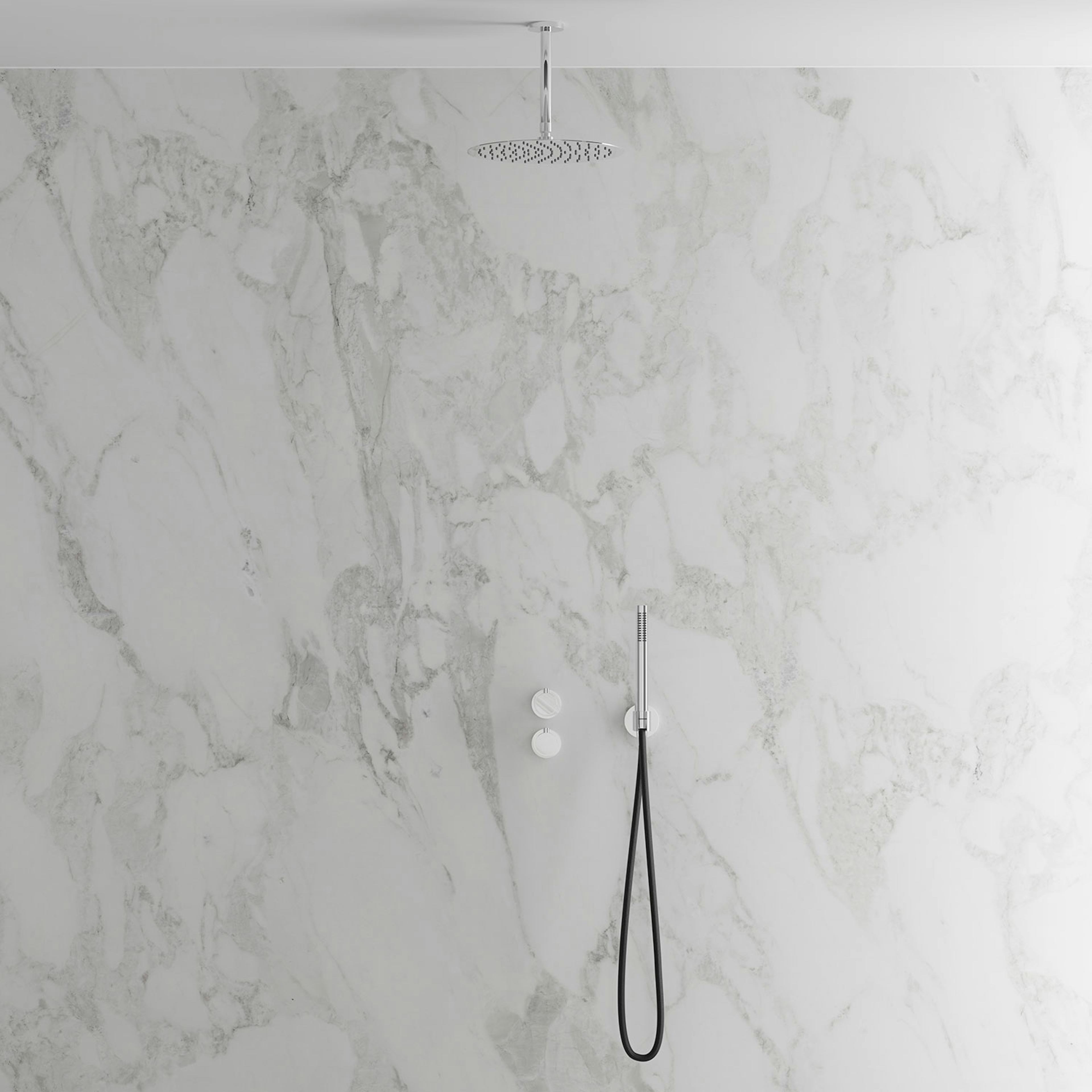 Dold monteringen bakom vägg ger badrummet ett minimalistiskt och harmoniskt intryck. Inkluderar en tunn takmonterad taksil med generös omkrets samt en cylindrisk handdusch som avger ett mjukt behagligt vattenflöde med bred spridning. Tidlös design som samspelar med ett skandinaviskt formspråk.
