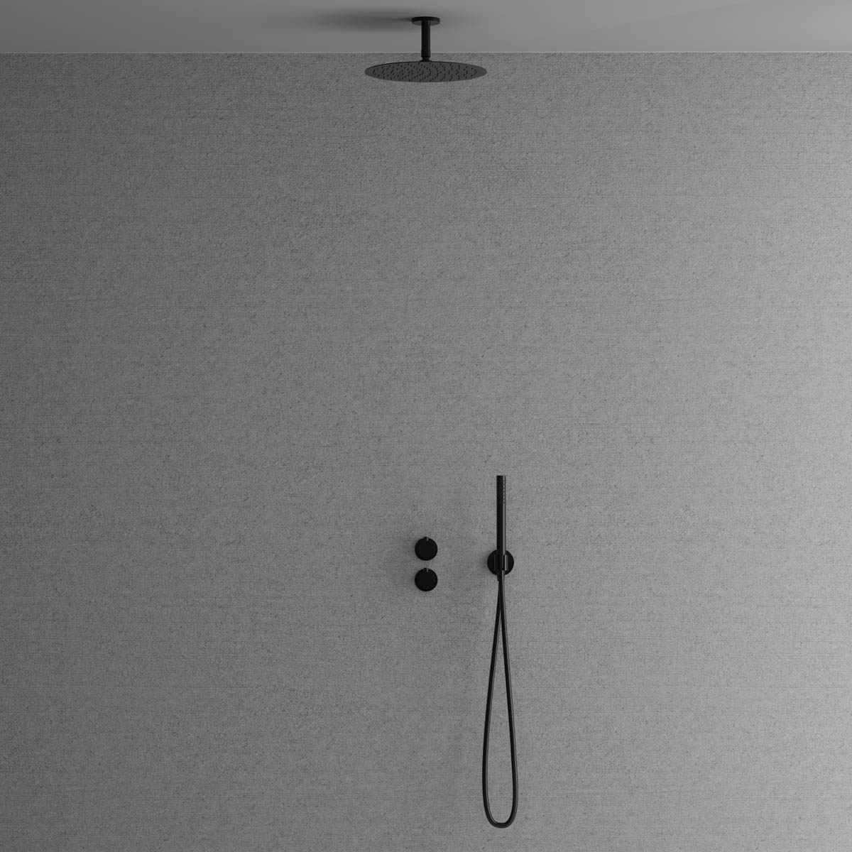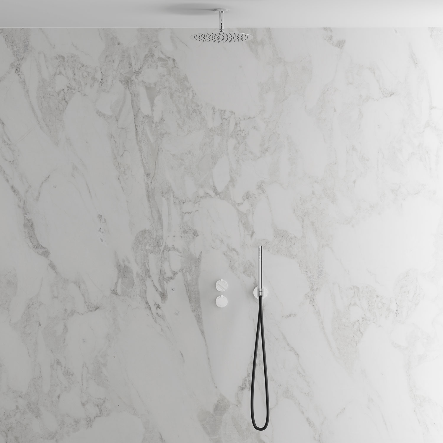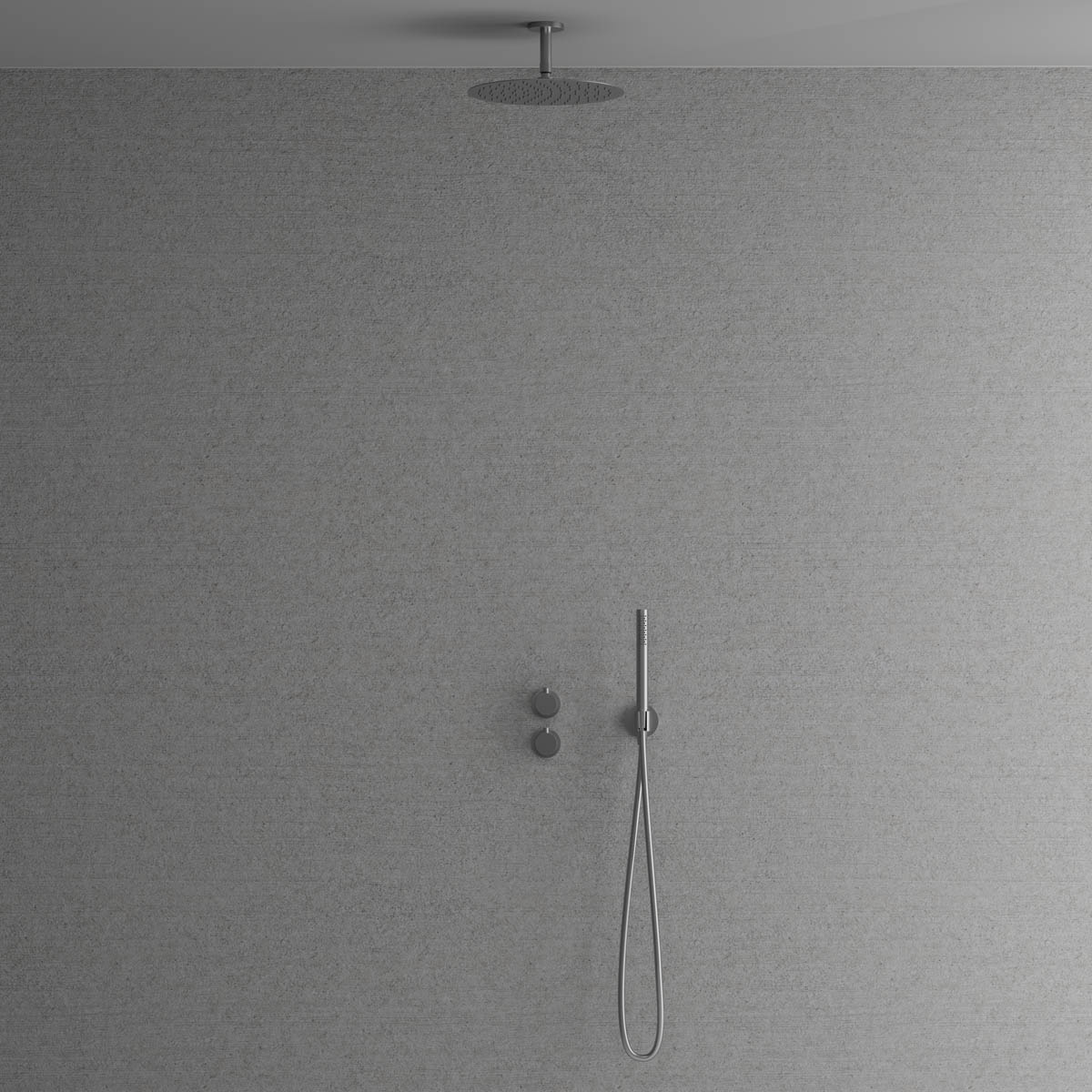 Dold montering bakom vägg ger badrummet ett minimalistiskt och harmoniskt intryck. Inkluderar en tunn takmonterad taksil med generös omkrets samt en cylindrisk handdusch som avger ett mjukt behagligt vattenflöde med bred spridning. Tidlös design som samspelar med ett skandinaviskt formspråk.