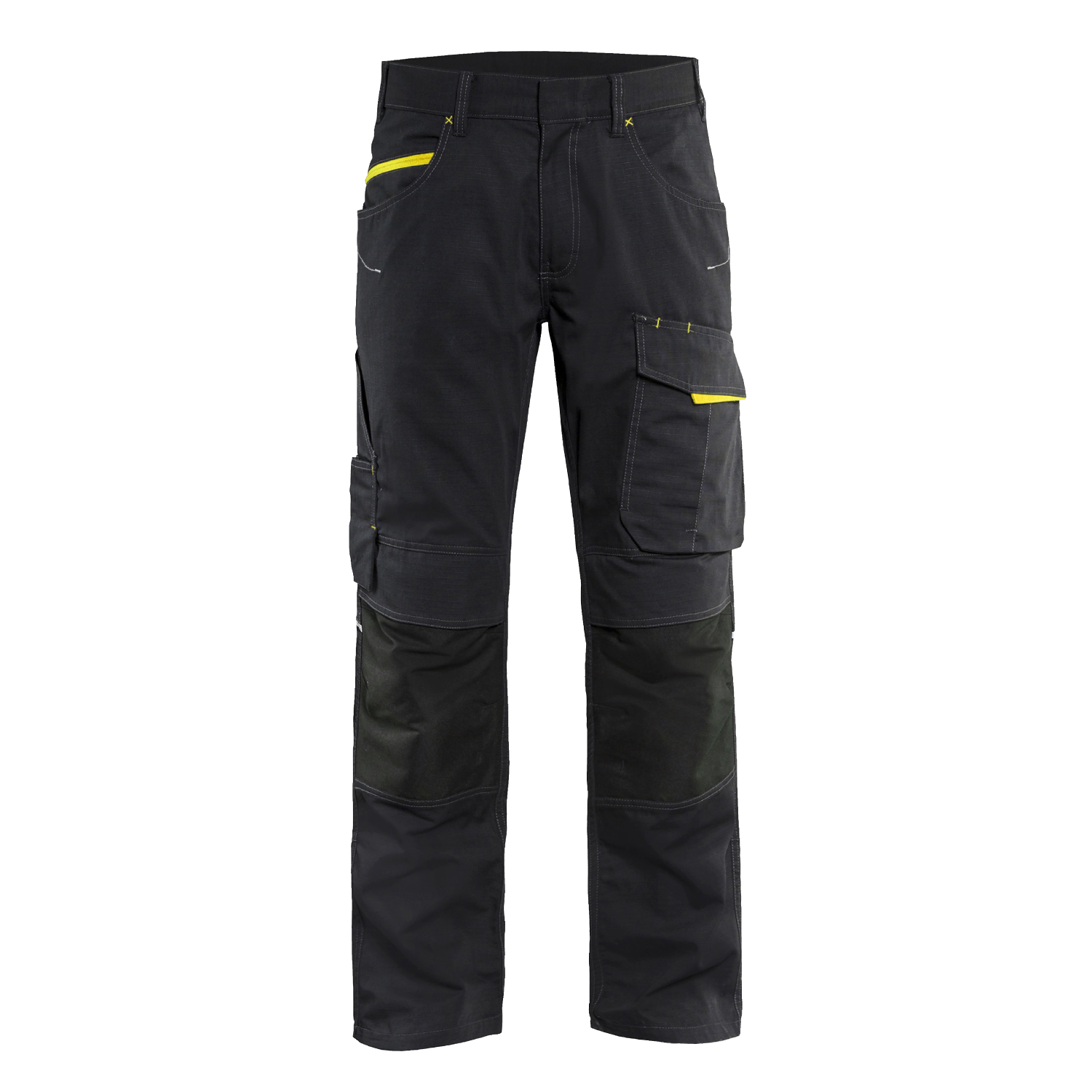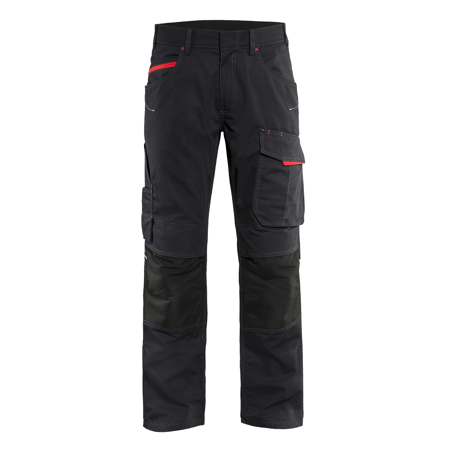 Servicebyxa från Blåkläder med förböjda ben och stretchpanel i gren, vad och knäskyddsficka. Byxan har gylf med plastblixtlås, hammarhank i sidans och D-ring. Försedd med benficka med lock, pennficka och invändig telefonficka i mesh, tumstocksficka med knivhållare och pennficka, insticksfickor och knäskyddsfickor som är toppmatade med lock och kardborrestängning. CORDURA®-stretch både ut- och invändigt för bättre ergonomisk passform. Benavslutet är justerbart med knappar.