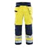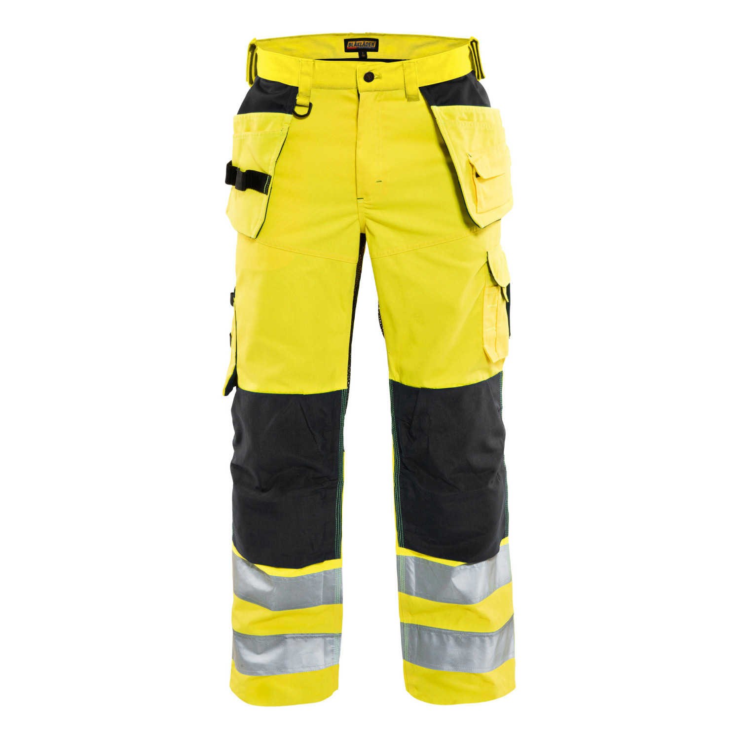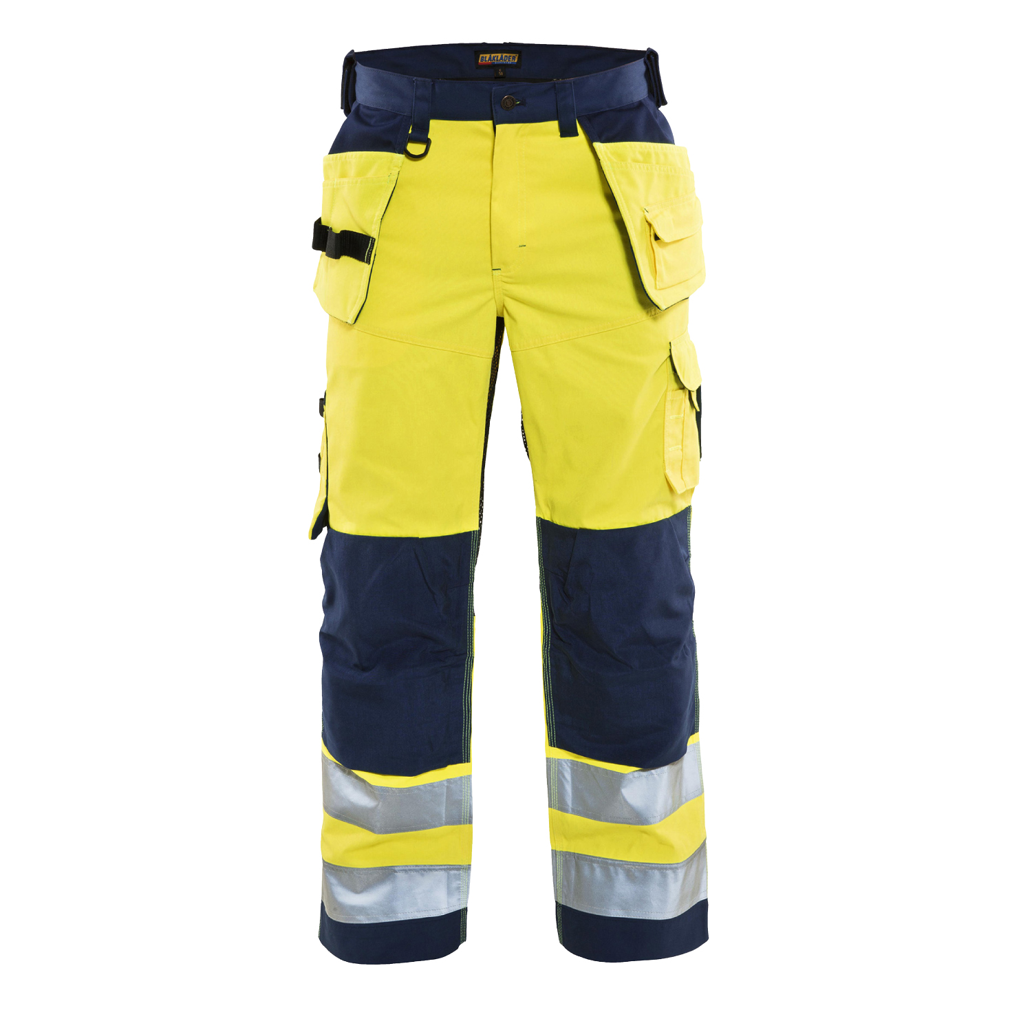 Varselbyxa från Blåkläder med 50 mm breda reflexer runt benen. Försedd med snedställda fickor och en extra ficka med dragkedja. Byxan har hällor, varav en med D-ring och gylf med plastblixtlås.