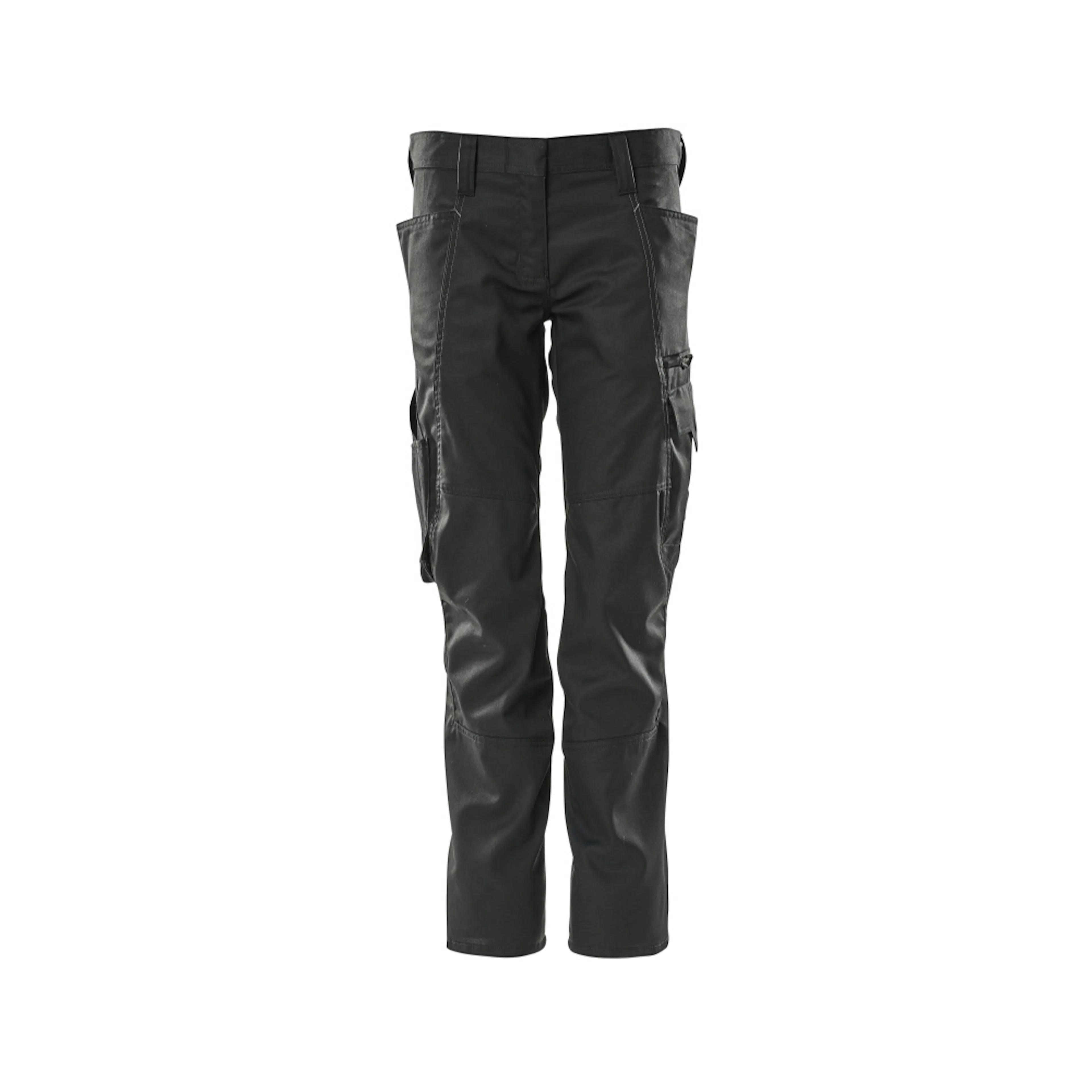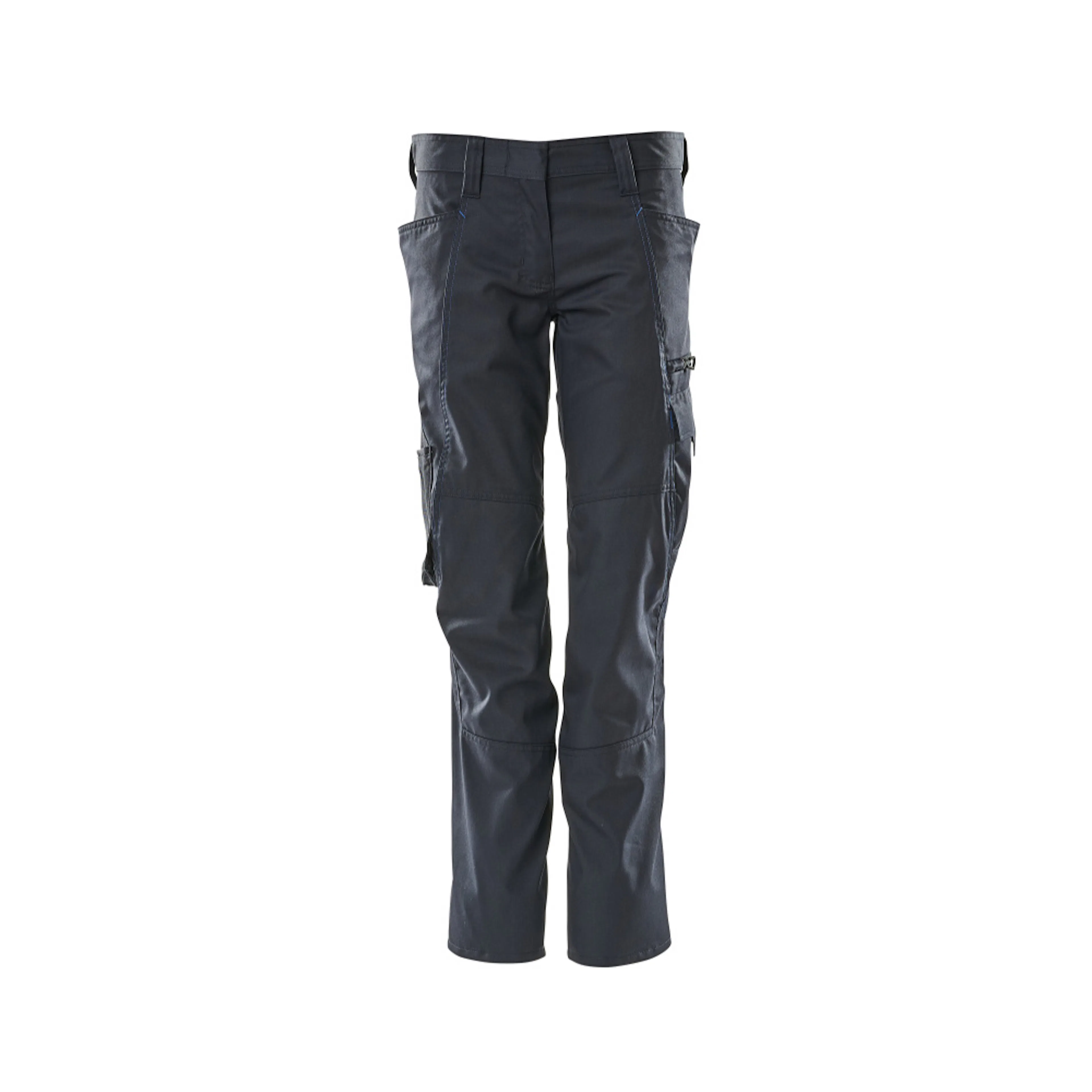 Lady passform PEARL. Lätt kvalitet. Tvånålsstickningar på benen och i grenen. Låg midja och formskuren linning. Byxbenen är ergonomiskt formade. Bältesstroppar. Stängning med blixtlås. Fickor på framstycket. Bakfickor. Benficka med telefonficka och lock med dold tryckknapp och inbyggd ID-korthållare. ID-kortshållaren är avtagbar. Tumstocksfickan är CORDURA®-förstärkt. Med tryck och reflexer.