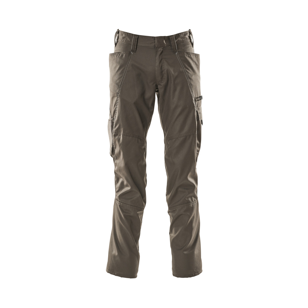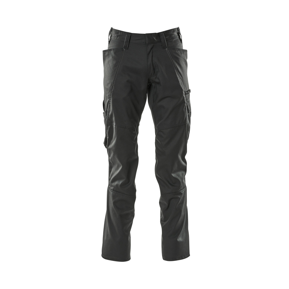 Enfärgade. Lätt kvalitet. Tvånålsstickningar på benen och i grenen. Låg midja och formskuren linning. Byxbenen är ergonomiskt formade. Bältesstroppar. Gylf med blixtlås. Fickor på framstycket. Bakfickor. Benficka med telefonficka och lock med dold tryckknapp och inbyggd ID-korthållare. ID-kortshållaren är avtagbar. Tumstocksfickan är CORDURA®-förstärkt. Med tryck och reflexer.