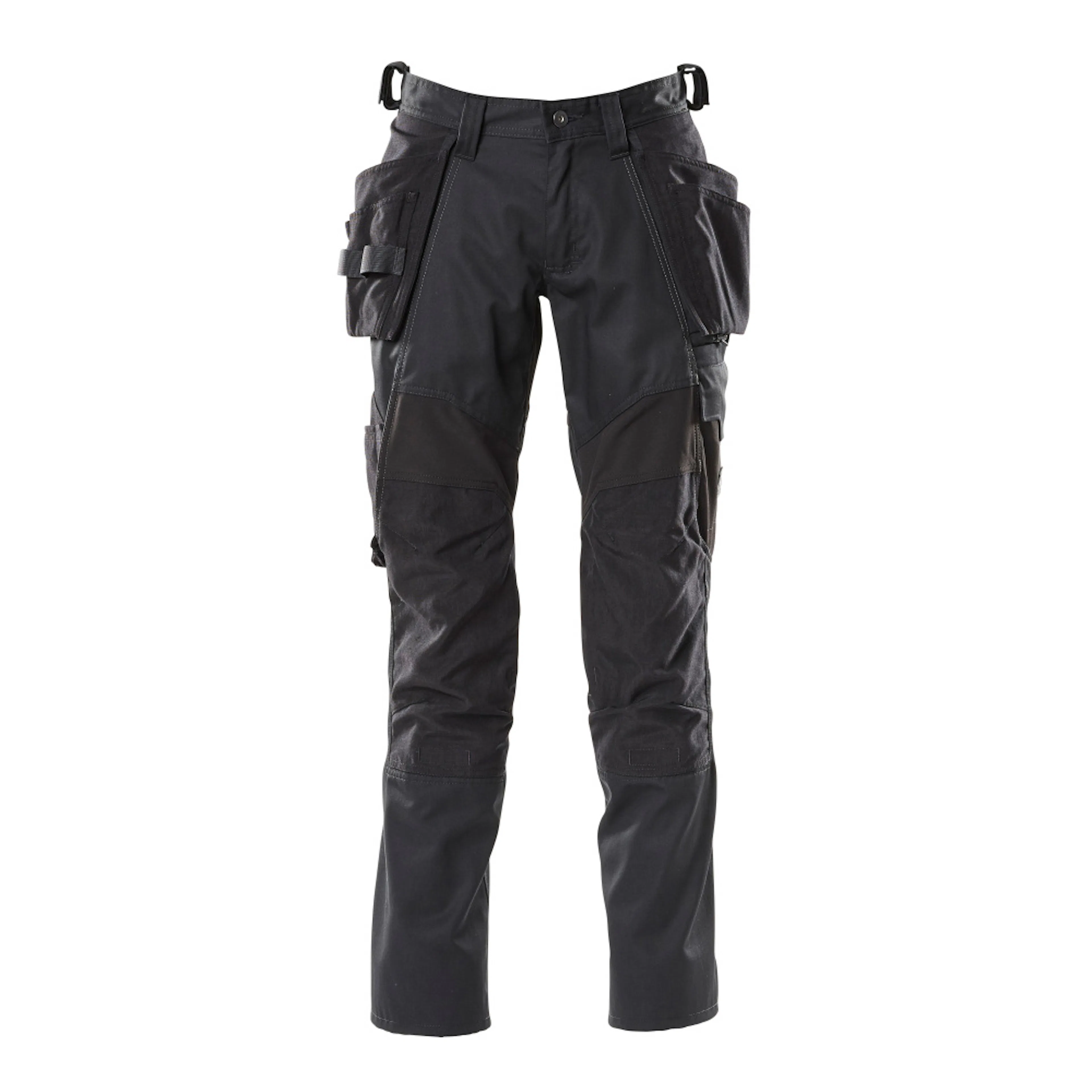 Många inlägg av elastiskt material som ger en unik rörelsefrihet. Den låga skärningen med formskuren linning ser till att byxorna följer och stöder alla kroppens rörelser. Ergonomiskt formade byxben är tillverkade efter kroppens naturliga rörelser. Hängfickor i slitstark CORDURA®. Knäfickorna i slitstarkt CORDURA® är reglerbara, så att knäskydden får den optimala placeringen. Som standard i tre olika benlängder så kan du välja den bästa passformen och den optimala placeringen av detaljer just för dig. Tyget tål industritvätt. Samcertifierade för användning med MASCOT:s knäskyddstyp SHORT eller LONG, eftersom knäskyddsfickan kan höjdjusteras.
