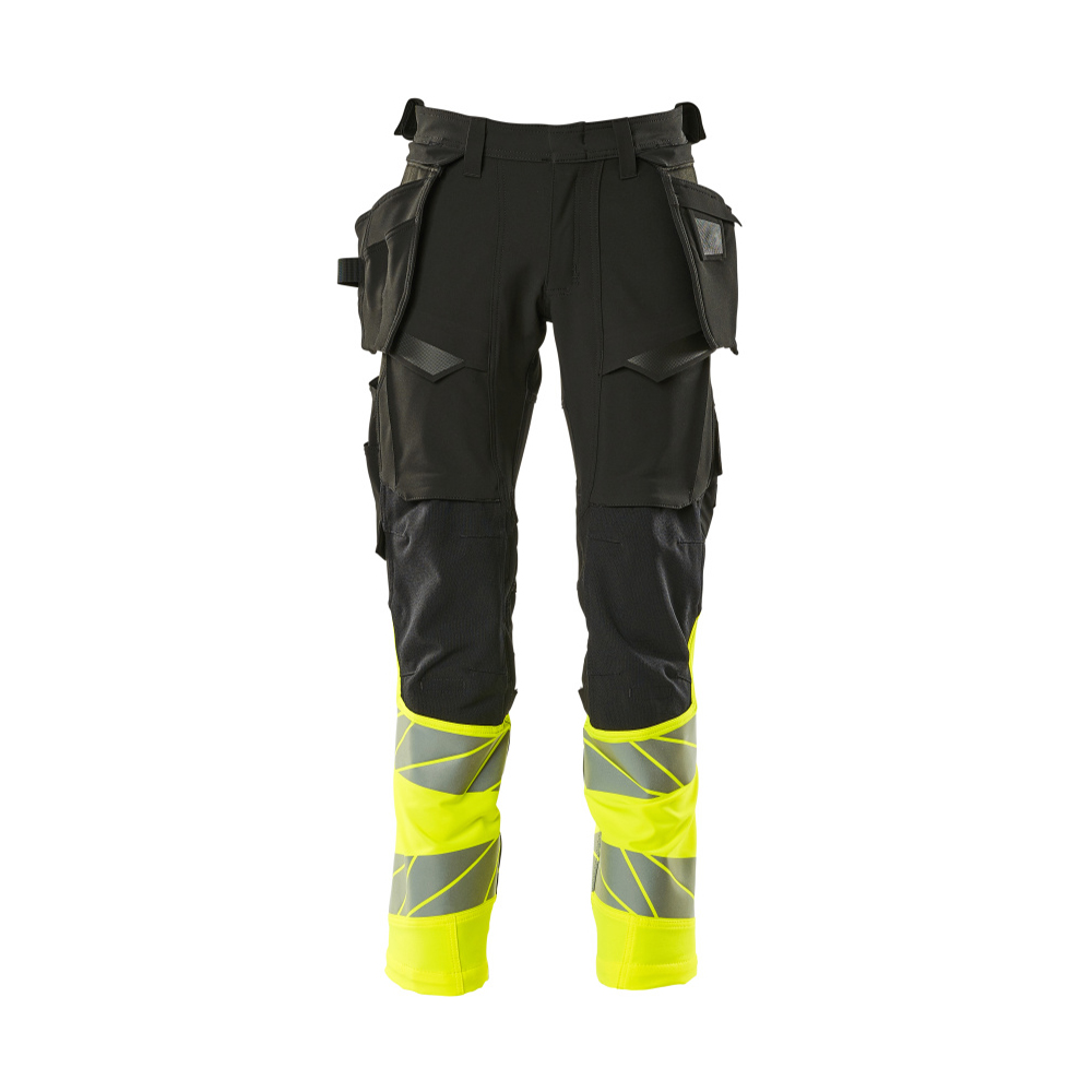 Fluorescerande kontrastfärg och med reflexer. Har en vattenavvisande yta. Tvåfärgat. Ultimate stretchtyg med låg vikt och bra slitstyrka. Tvånålsstickningar på benen och i grenen. Låg midja. Knäppningen är dold. Byxbenen är ergonomiskt formade. Avtagbara hängfickor. Stängning med tryckknapp på den innersta hängfickan. Hängficka med fodrad telefonficka och magnetstängning. Hängfickor med Kevlar® och CORDURA®-förstärkningar. Bältesstroppar. Verktygsstropp på båda sidor av linningen. Gylf med blixtlås. Fickor på framstycket. Bakfickor med förstärkningar och lock. Dold hammarögla i båda sidorna. Knapp (avtagbar) för montering av knivhållare. Tumstocksfickor med Kevlar®-förstärkningar. Fickor med lock på framsidan av låret. Knäfickor i CORDURA® tvåvägs stretchtyg med ventilation. Enkel individuell justering av knäficka höjd. Benficka med fodrad telefonficka, magnetstängning och inbyggd ID-kortshållare. ID-kortshållaren är avtagbar. Lodrätt blixtlås med möjlighet för ventilation på baksidan av låret. Med tryckeffekter. Innerbenslängden kan ökas med 3 cm genom att ta bort den invändiga röda sömmen vid foten. Vi rekommenderar 00718-100, 00418-100, 50454-916 & 20118-915 knäskydd till den här modellen. Samcertifierade med knäskyddstyp SHORT eller LONG enligt EN 14404.