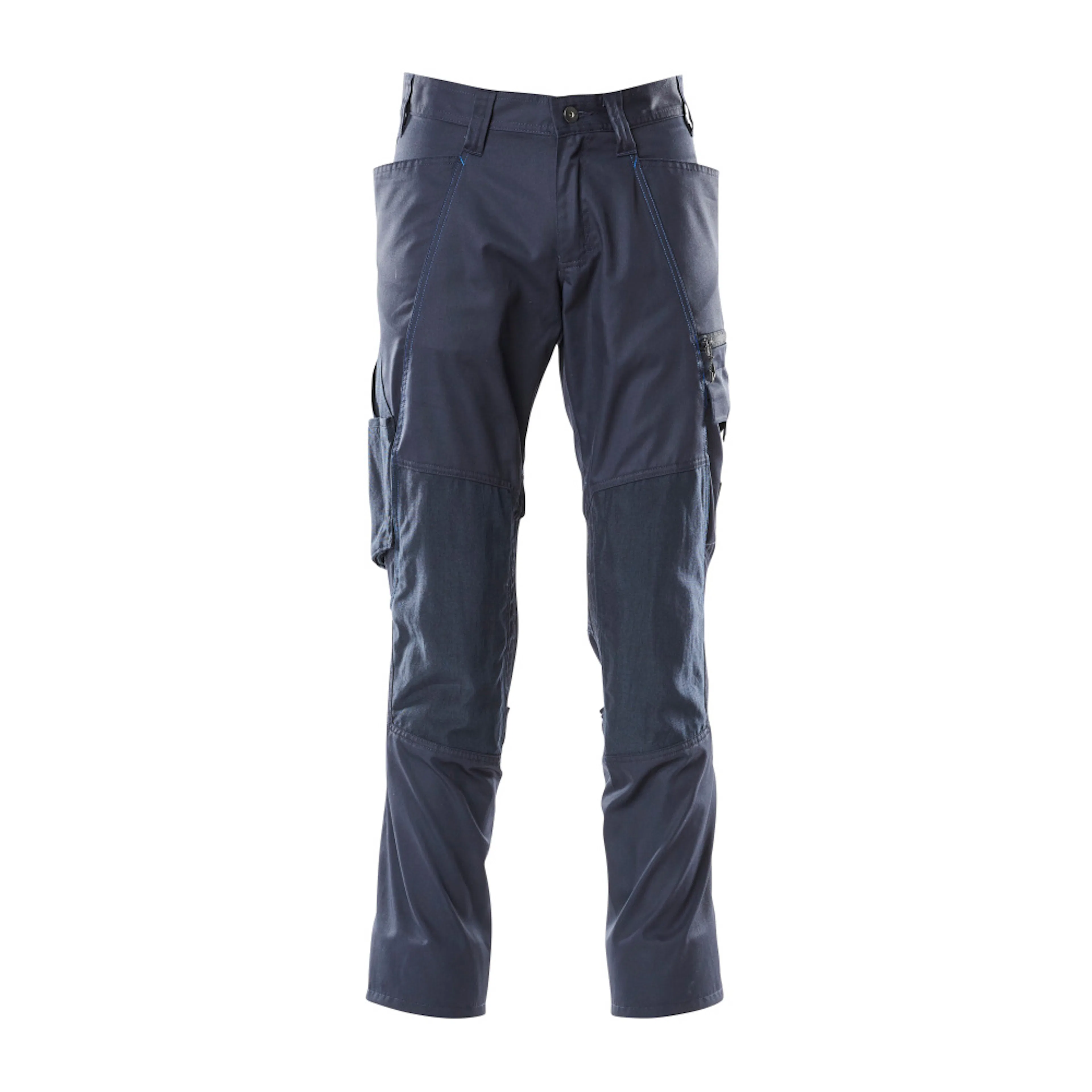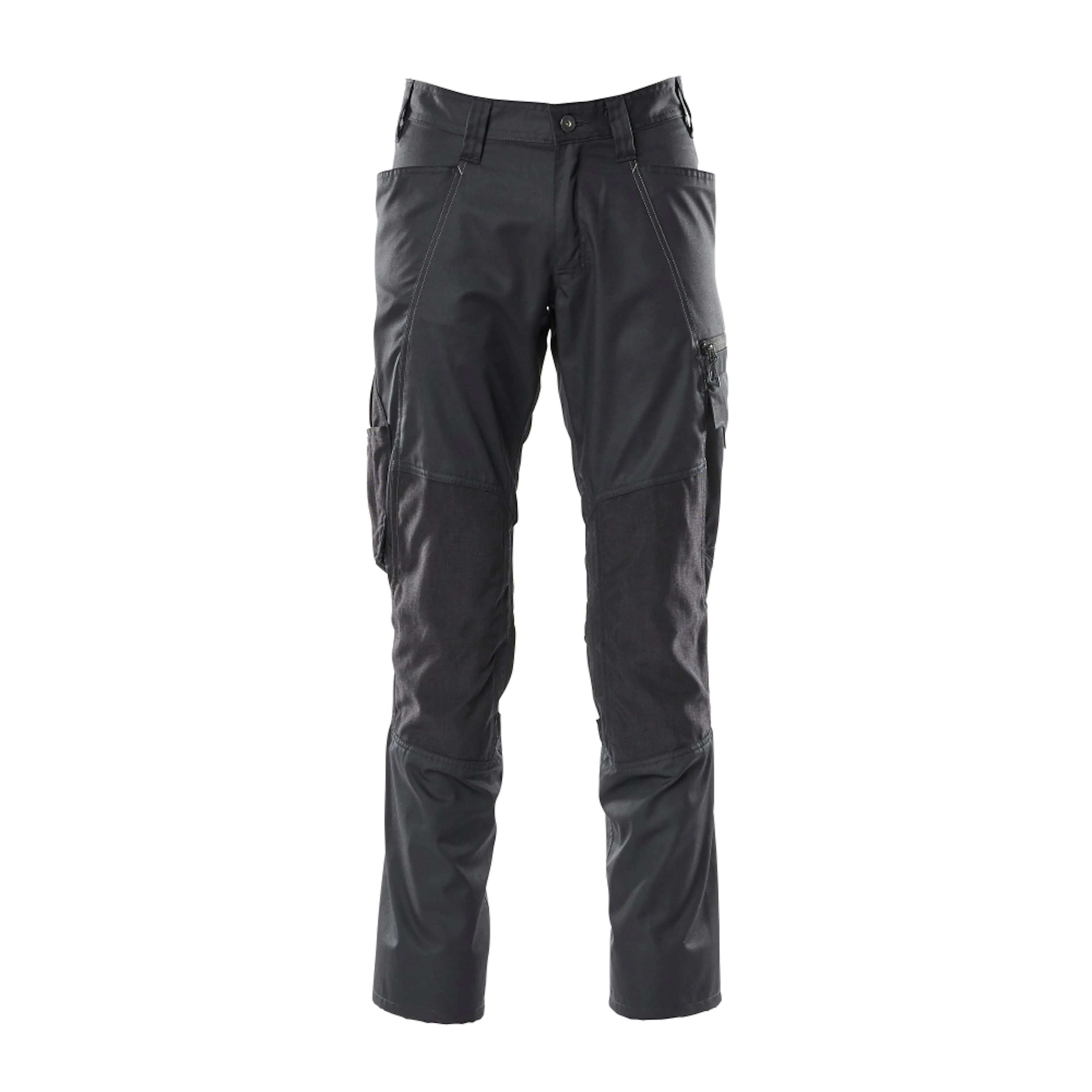 Enfärgade. Lätt kvalitet. Tvånålsstickningar på benen och i grenen. Låg midja och formskuren linning. Byxbenen är ergonomiskt formade. Bältesstroppar. Gylf med blixtlås. Fickor på framstycket. Bakfickor. Benficka med telefonficka och lock med dold tryckknapp och inbyggd ID-korthållare. ID-kortshållaren är avtagbar. Tumstocksfickan är CORDURA®-förstärkt. Justerbara knäfickor i slitstark CORDURA® (500 D). Enkel individuell justering av knäficka höjd. Med tryck och reflexer. Vi rekommenderar 00718-100, 00418-100, 50454-916 & 20118-915 knäskydd till den här modellen. Samcertifierade med knäskyddstyp SHORT eller LONG enligt EN 14404.