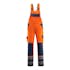 Fluorescerande och med reflexer. Teflon® gör produkten smutsavvisande. Tvåfärgat. Trenålsstickningar på benen och i grenen. Hängslen, justerbara och med kort, kraftig resår och spännen av plast. Bröstficka med lock och tryckknappar. Innerficka med kardborreband. Linningen är justerbar. Fickor på framstycket. Gylf med blixtlås. Bakfickor med förstärkning - den ena med lock och kardborreband. Hammarstroppen är justerbar. Benficka med flera fack, lock och justerbart kardborreband. Pennfickor. Telefonbenficka med lock, och justerbart kardborreband. Tumstocksficka. Knäfickor. Vi rekommenderar 00718-100, 50451-916 & 20118-915 knäskydd till den här modellen. Samcertifierade med knäskyddstyp LONG enligt EN 14404.