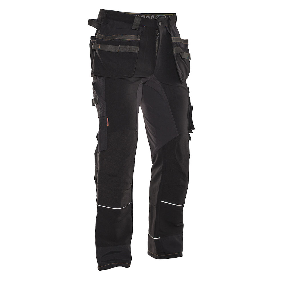 Smidig 4-vägs stretch i slitstarkt Rip-stop material. Rymliga hölsterfickor med extrafack och förstärkt insida som kan stoppas ned i framfickorna. Silikonband i byxlinningen håller byxan på plats. Grenkil med förstärkt stretch Cordura. Delvis frihängande bakfickor gör att du lättare kommer åt innehållet. Extra hällor för bältet på de största storlekarna. Hammarhank. Tumstocksficka med knivhållare. Benficka med täckt blixtlås, ID-kortsfack och telefonfack. Förböjda knän med knäskyddsfickor i slitstark stretch Cordura med 3M´s reflexpasspoaler och två höjdnivåer. Mesh i knävecken för ventilation. Förstärkt benslut i polyamid som inte absorberar fukt. Reflexpasspoal och dragsko i benslutet.