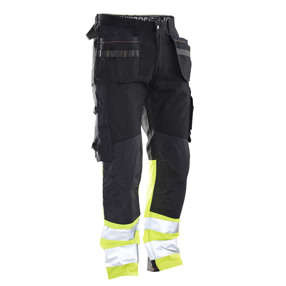 Rymliga hölsterfickor med extrafack och förstärkt insida. Påsydda förstärkta framfickor som hölsterfickorna kan stoppas ned i. Hammarhank. Bakfickor med förstärkt insida. Benficka med telefonfack och ID-kortsfack. Förböjda knän för optimal passform. Knäskyddsfickor i slitstark polyamid med två höjdnivåer för knäskydden. Fluorescerande tyg och reflexer på benen. Benslut i polyamid förhindrar att fukt sugs upp.