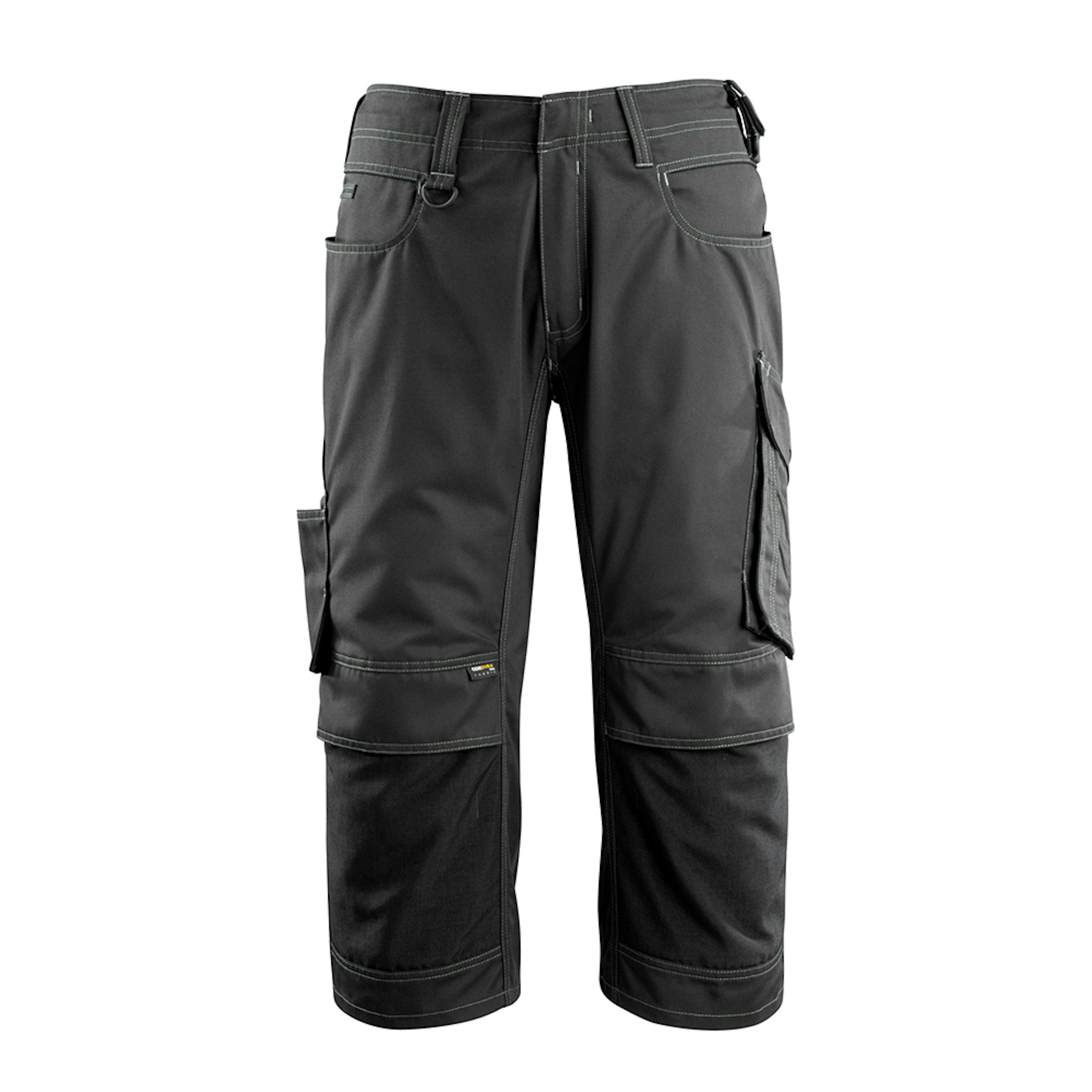 Slitstarka trenålssömmar på ben och i skrev förlänger produktens livslängd. Utmärkt passform med formskurna ben och kilar på insidan av ben och skrev (med extra förstärkning). Sned, rymlig benficka med lättillgänglig telefonficka. Av slitstark CORDURA® – med öppning för knäskydd från ovansidan och med lucka så att inte smuts samlas. Knäfickorna kan justeras så att knäskydden är placerade optimalt i förhållande till dina knän. Samcertifierade för användning med MASCOT:s knäskyddstyp, SHORT.