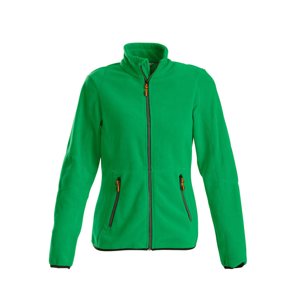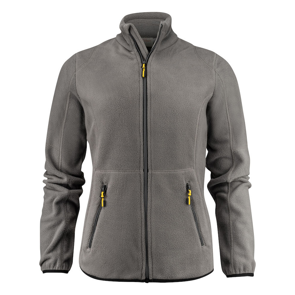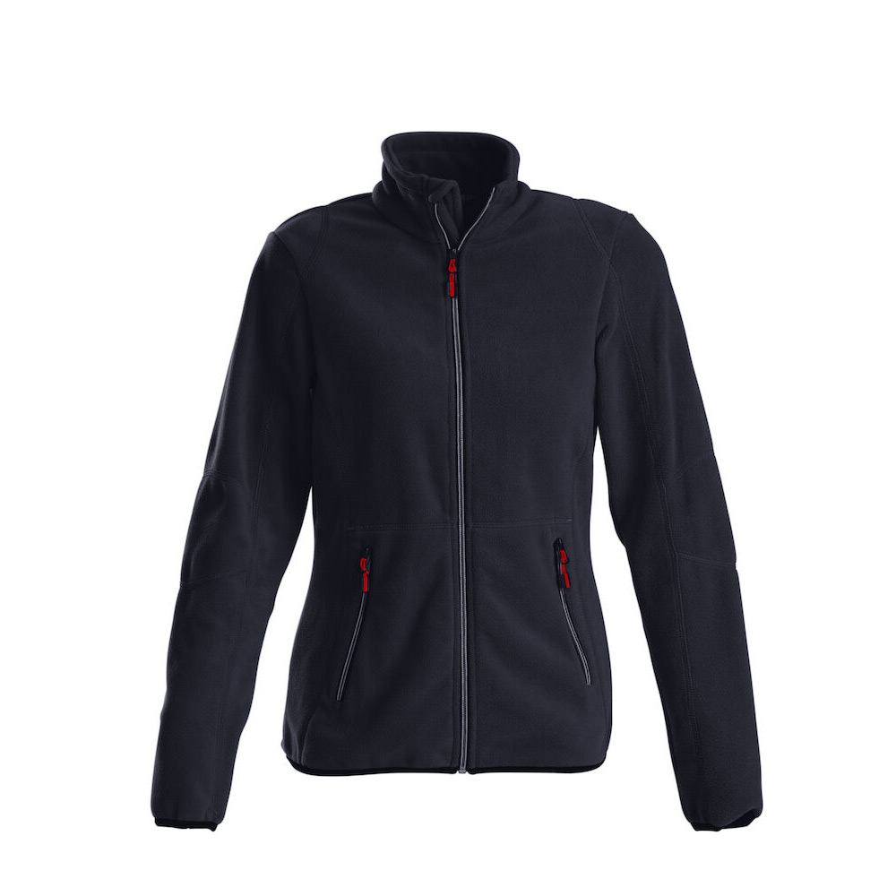 Fleecejacka dam med tvåfärgade dragkedjor framtill och på fickor. Dekorerad med flatlocksömmar. Feminin passform. Möjligt att köpa till dragkläppar i andra färgställningar som matchar kundens företagslogga.