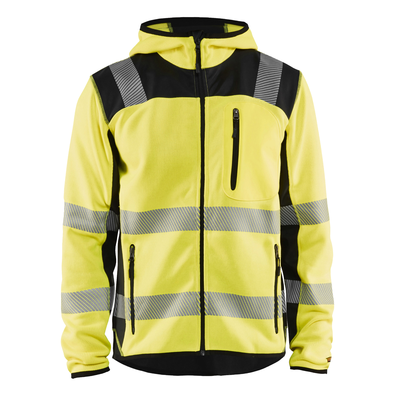 Stickad jacka från Blåkläder i varsel med huva i snygg design och bekväm kvalitet. Jackan har skurna reflexer för bra andningsförmåga och elasticitet. Försedd med dragkedjor och förstärkt med softshellmaterial på axlar, ärmar och i ryggslut för ökad slitstyrka. Funkar för både fritid och arbete.