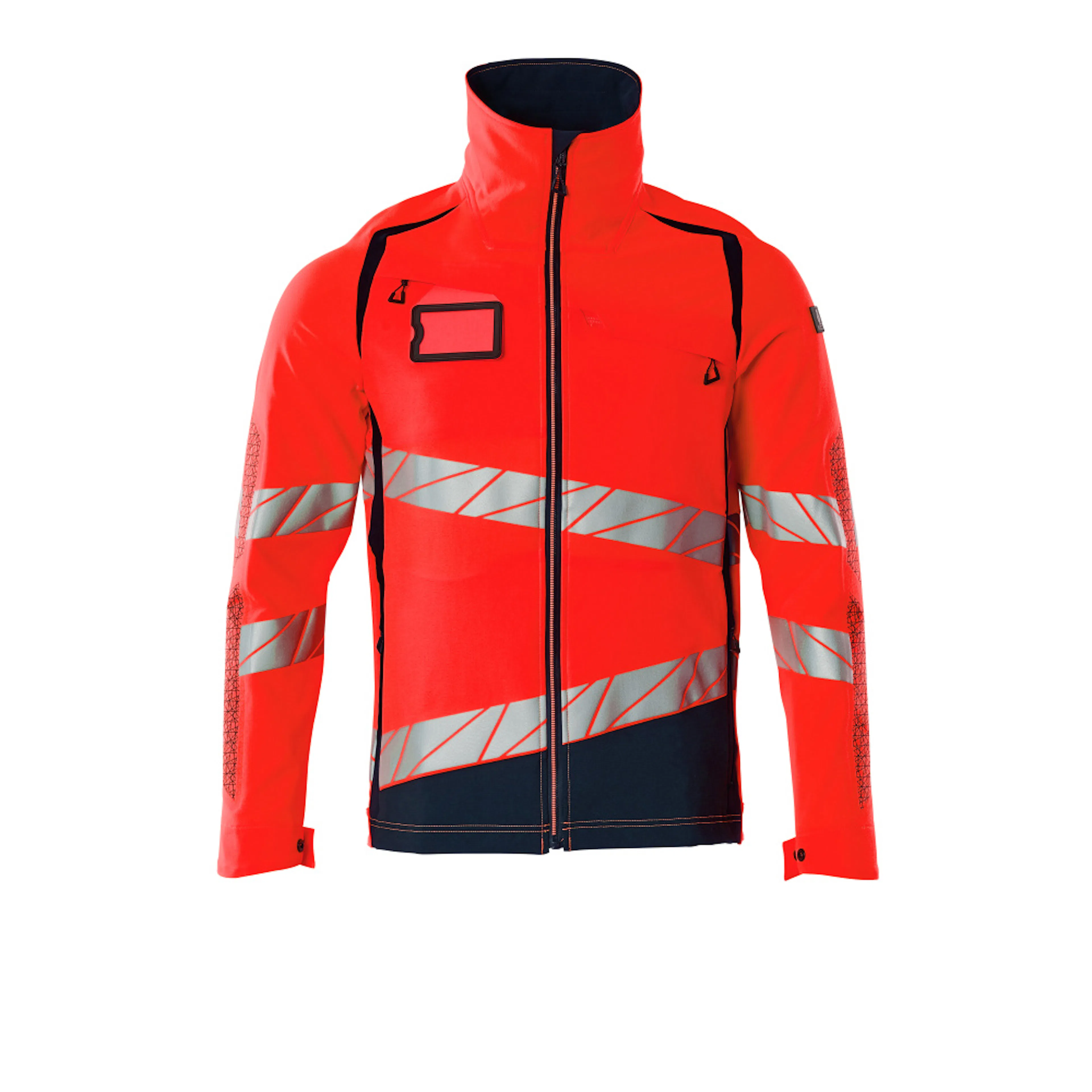Fluorescerande med sneda tvärgående reflexer. Har en vattenavvisande yta. Ultimate stretchtyg med låg vikt och bra slitstyrka. Hög krage. Tvåfärgat. Stängning med blixtlås och invändigt vindfång. Förberedd för montering av ID-kort. Bröstficka med blixtlås. Framfickor med blixtlås. Innerfickor. Resår i sidorna och nederkanten. Resår vid handleden. Ventilation under ärmarna. Med tryckeffekter.
