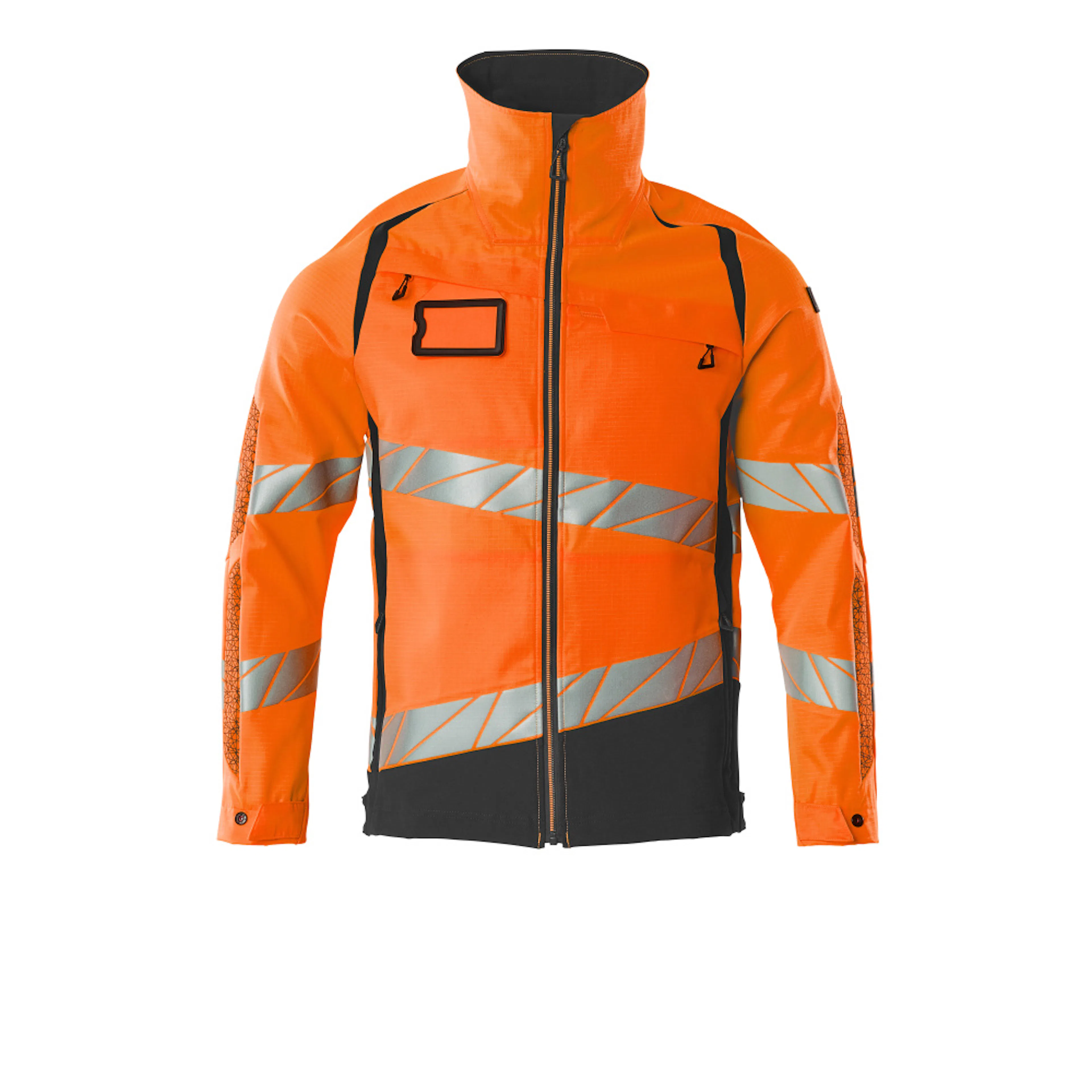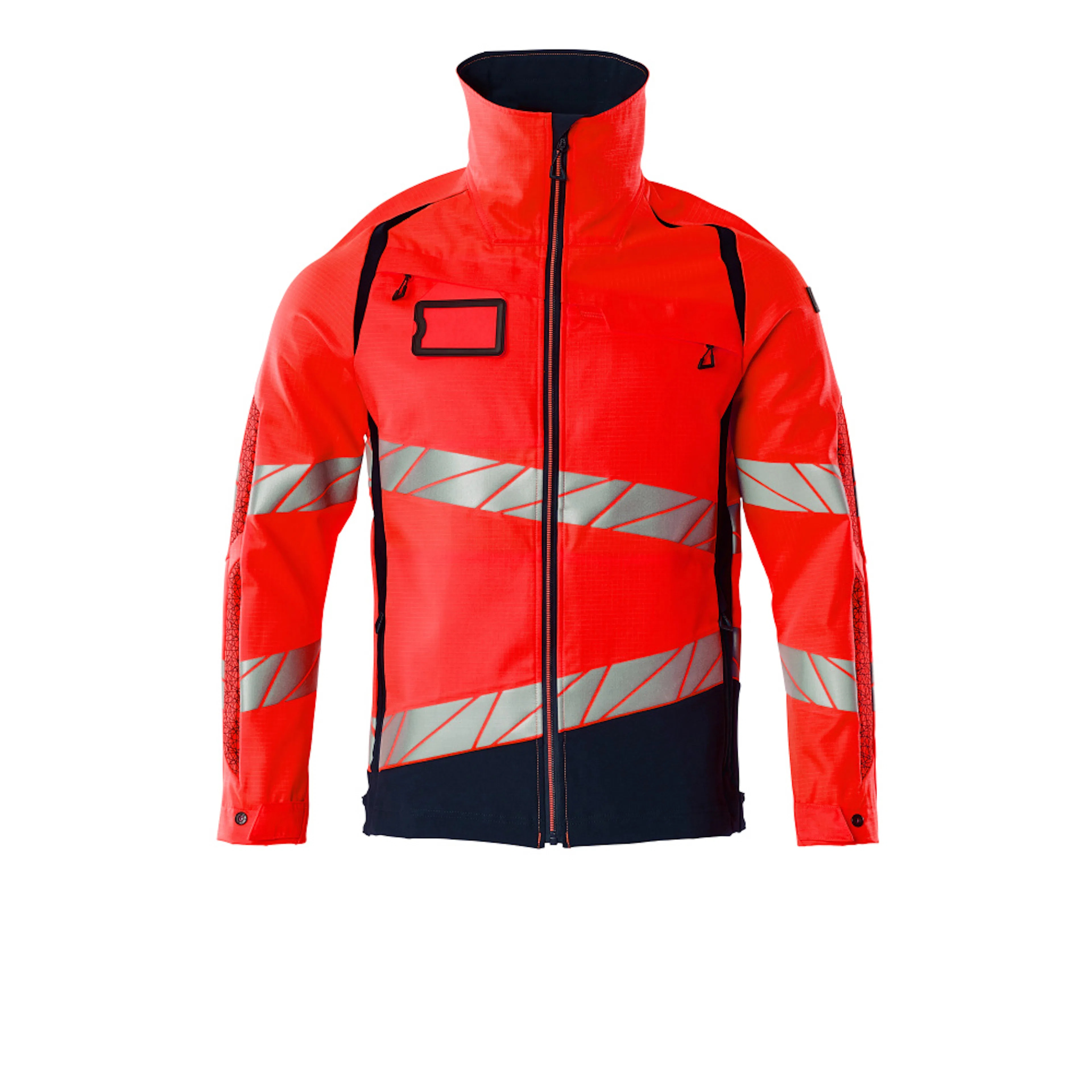 Fluorescerande med sneda tvärgående reflexer. Delar av produkten är av stretchtyg. Kombination av lättviktigt tyg kvalitet 236 och ULTIMATE STRETCH kvalitet 511. Tvåfärgat. Hög krage. Stängning med blixtlås och invändigt vindfång. D-ring. Bröstficka med blixtlås. Framfickor med blixtlås. Innerfickor. Resår i sidorna och nederkanten. Resår vid handleden. Med tryckeffekter.