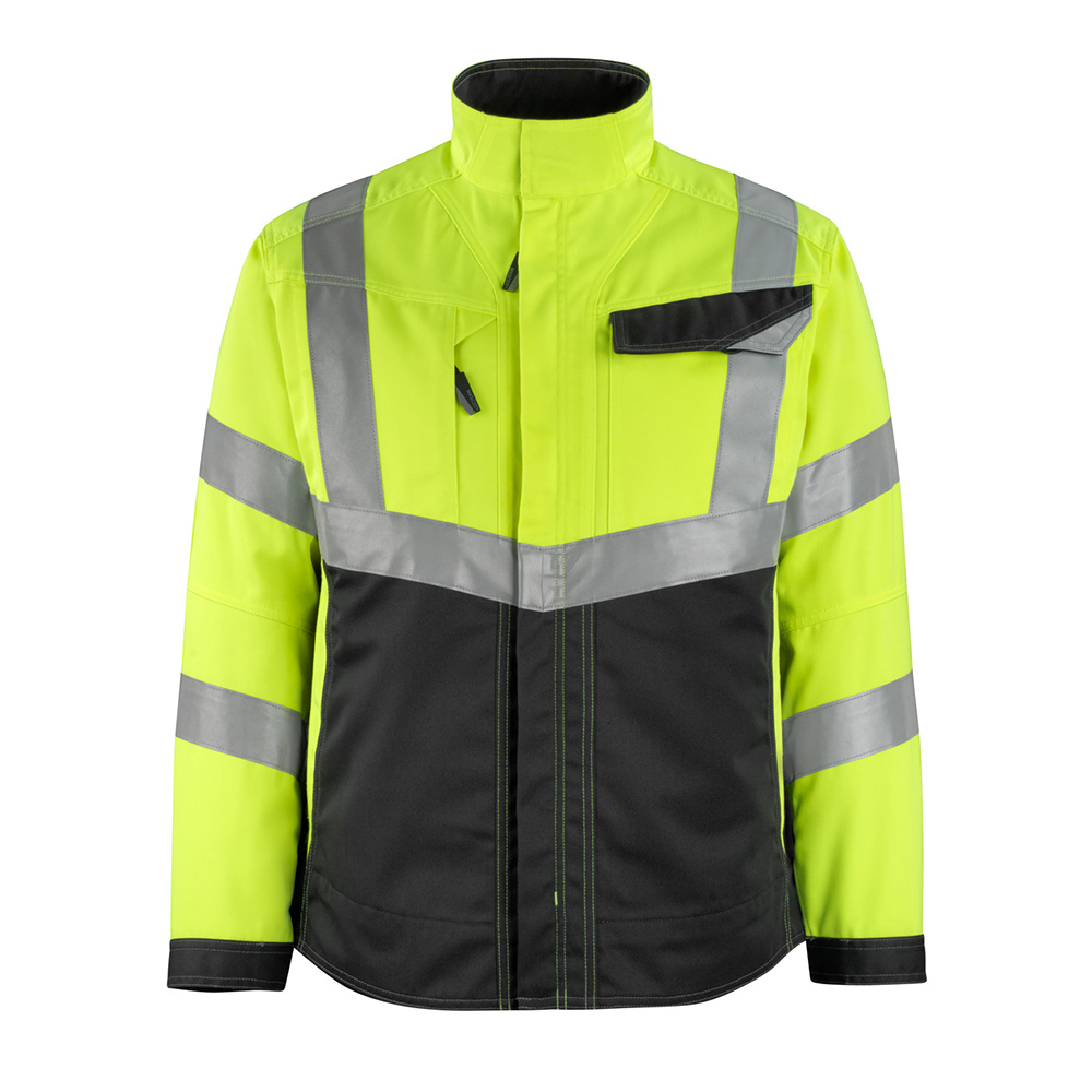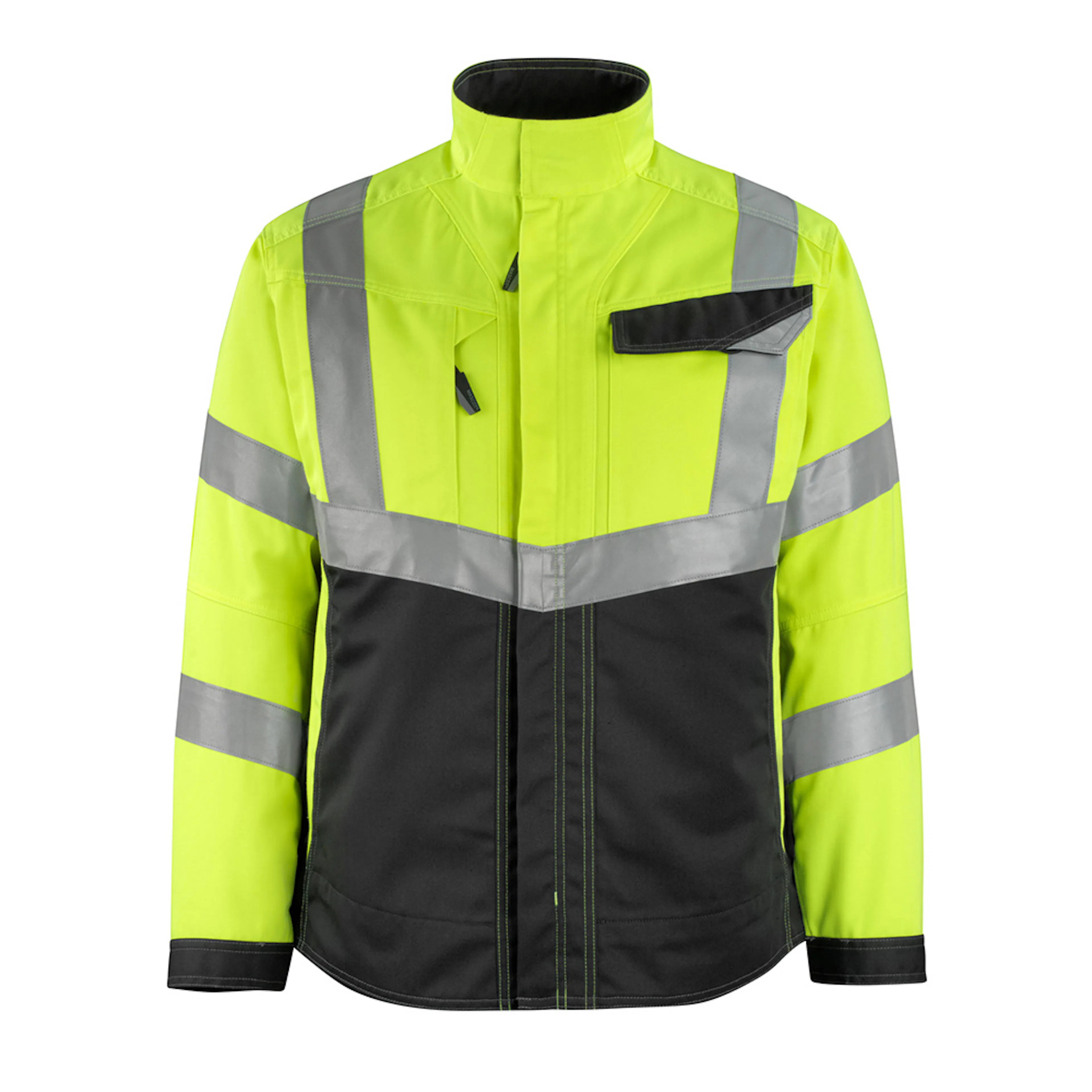 Fluorescerande med lodräta och sneda tvärgående reflexer. Tvåfärgat. Teflon® gör produkten smutsavvisande. Hög krage. Tvånålsstickning på skuldra och i sidan. Stängning med blixtlås och vindskydd med tryckknappar. Ryggen är förlängd. Bröstficka med blixtlås. Bröstficka med lock och tryckknapp. D-ring. Ergonomiskt utformade ärmar ger god rörelsefrihet. Fickor på framstycket. Innerfickor. Ventilation under ärmarna. Linning med tryckknappjustering. Manchetter med tryckknappar.