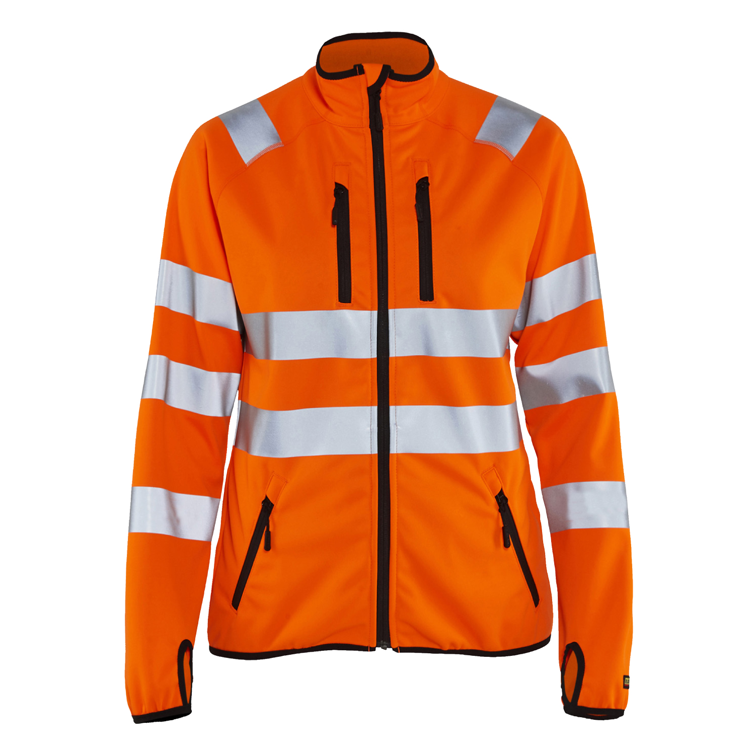 Varseljacka med hög krage i dammodell från Blåkläder. Kan bäras året runt, antingen som ett andra lager under jackan eller som ytterplagg beroende på väder. Jackan är i softshell och har 50 mm breda transferreflexer för ökad synlighet och elastiska band i ärmavslut samt nederkant för extra komfort. Både bröst- och framfickor stängs med blixtlås och tröjans frontstängning har ett kraftigt tvåvägsblixtlås i plast.