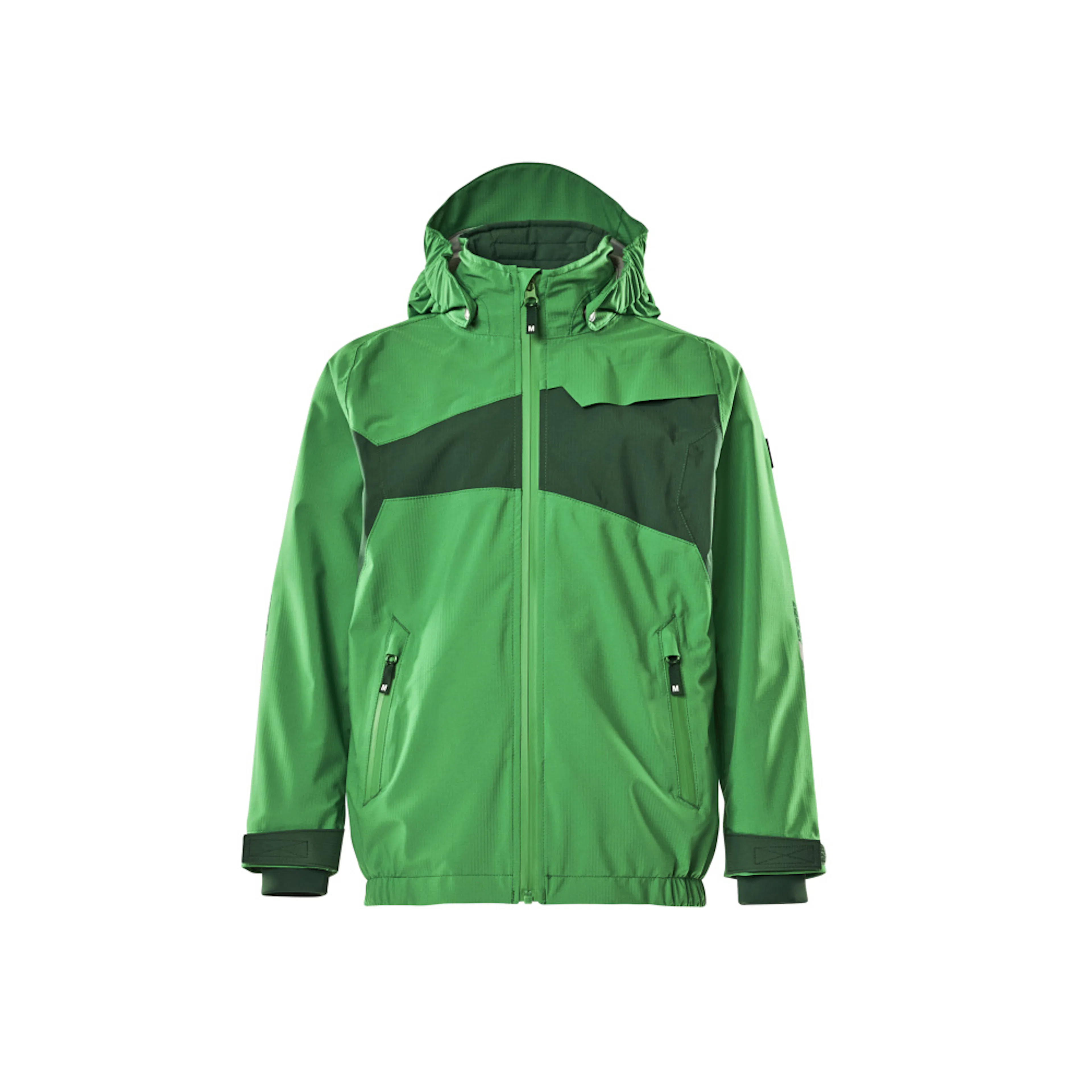Vindtät och vattenavvisande. Löstagbar huva med foder. Knäppning med blixtlås och invändig vindflik så att vinden stängs ute. Ribbstickning vid handlederna sluter åt bra och håller ute kylan. Extra synlig för omgivningarna med hjälp av reflexeffekter.