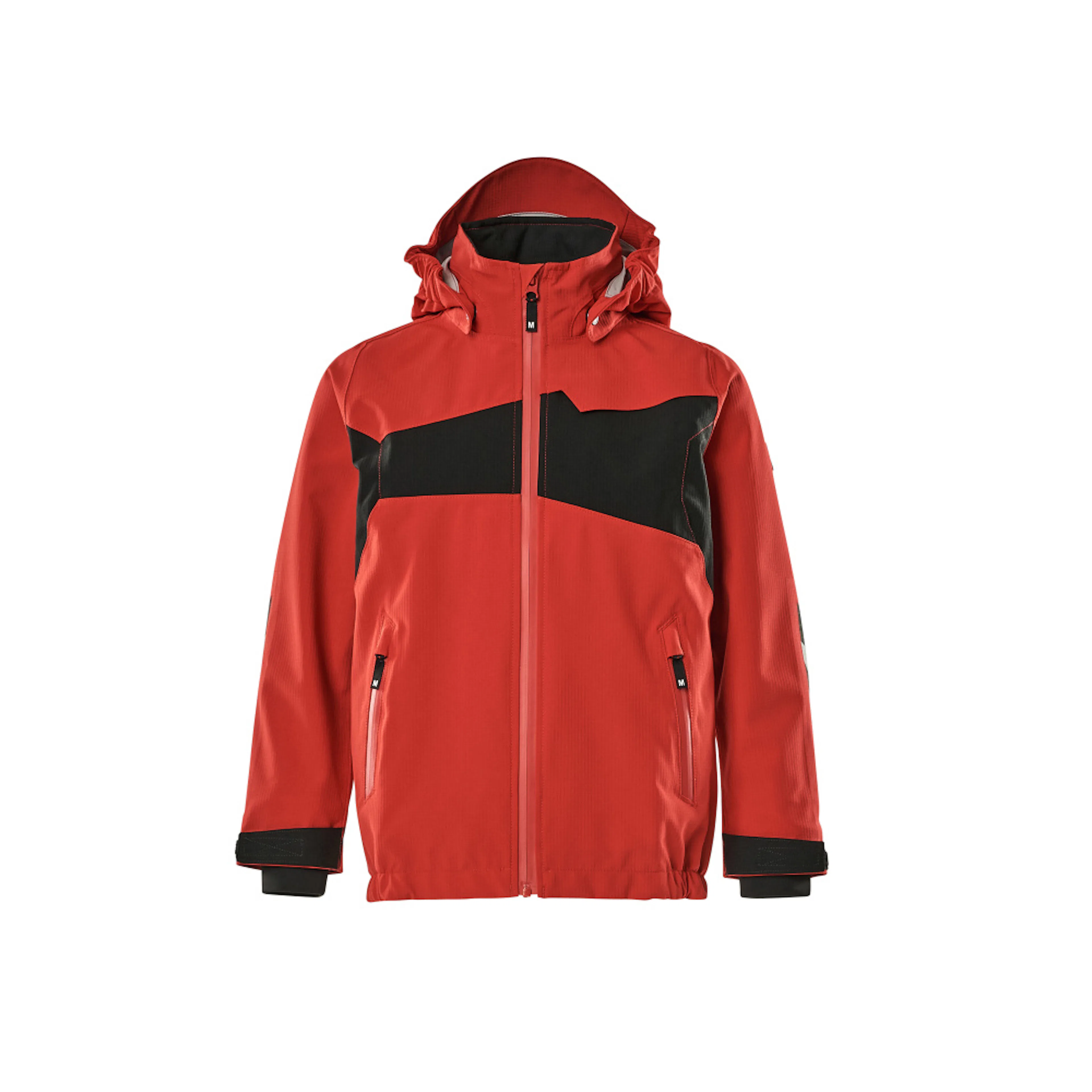 Vindtät och vattenavvisande. Löstagbar huva med foder. Knäppning med blixtlås och invändig vindflik så att vinden stängs ute. Ribbstickning vid handlederna sluter åt bra och håller ute kylan. Extra synlig för omgivningarna med hjälp av reflexeffekter.