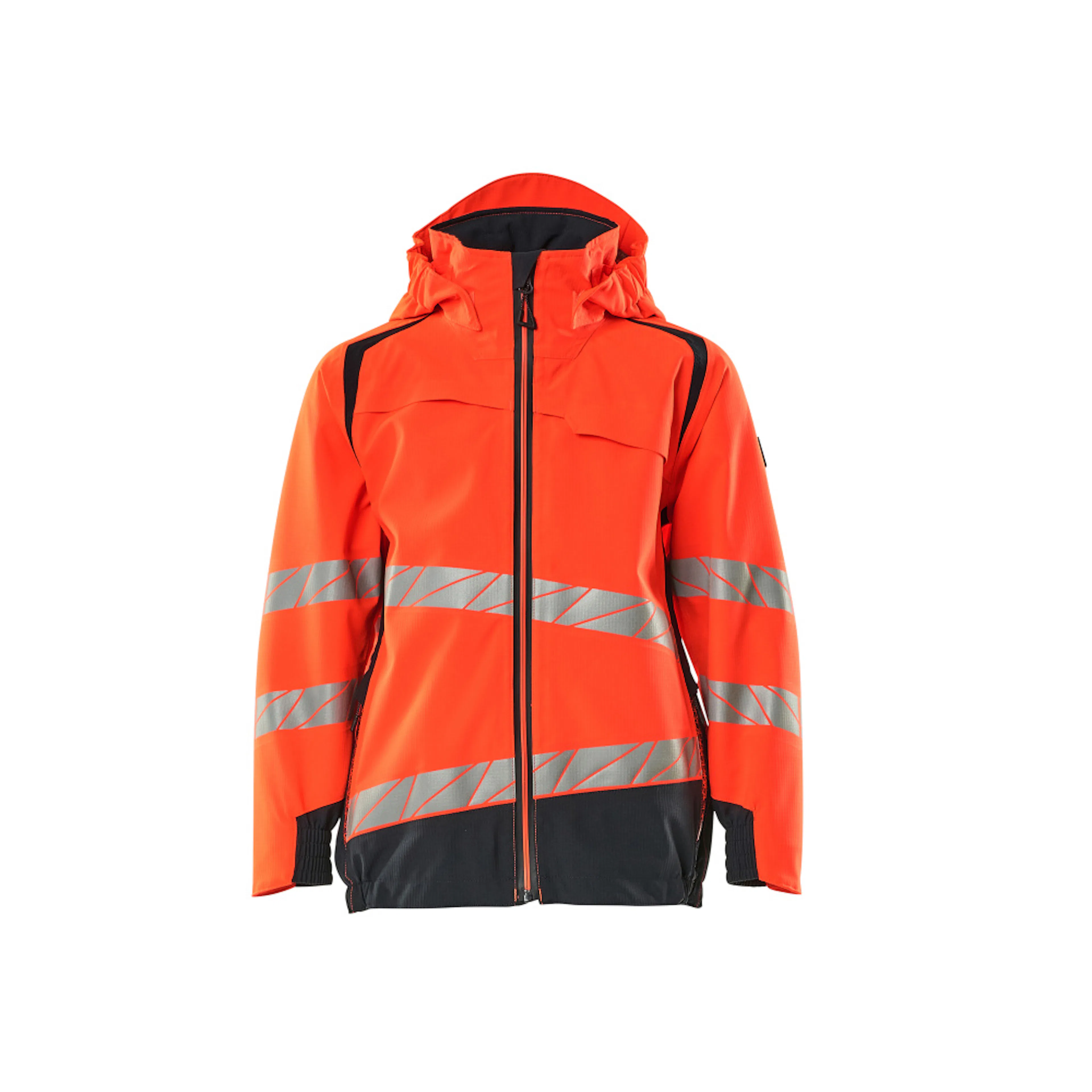 Tvåfärgat. Fluorescerande med sneda tvärgående reflexer. Hög andningsbarhet samt vind- och vattentät. Sömmarna är tejpade. Avtagbar fodrad huva med resår. Stängning med blixtlås och invändigt vindfång. Framfickor med blixtlås. Resår vid handleden. Resår i sidorna och nederkanten.