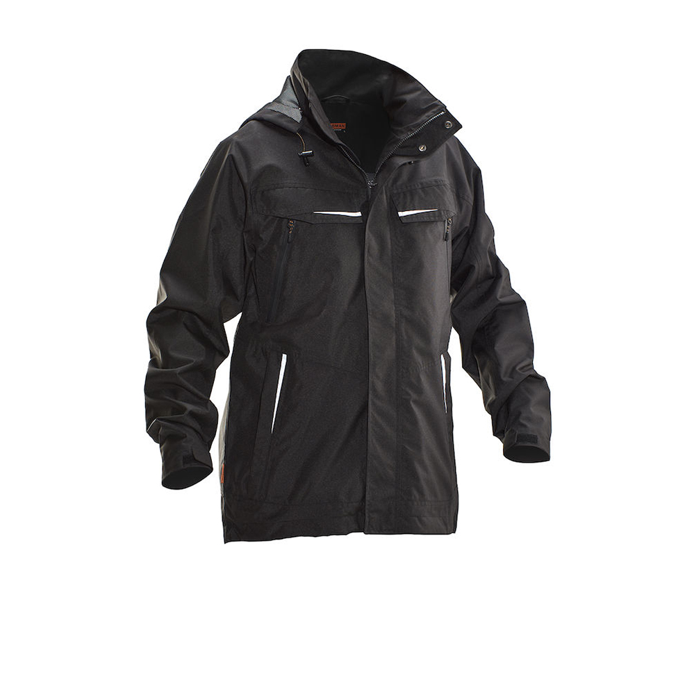 Vind- och vattentät skaljacka med tejpade sömmar. Andasfunktion, som är enligt lager på lager-principen. Meshfoder skapar luftbuffert och ventilation. Generöst med dubbla bröstfickor; två med ficklock och kardborrestängning och två med vattentäta blixtlås. Framfickor med ficklock och blixtlås. Tre stycken innerfickor, två med mesh och blixtlås, en med kardborrestängning. Reglerbar i ärm och nederkant. Huva med dragsko som är avtagbar med tryckknappar. Vattenpelare: 23000 mm. Andasfunktion: 3300 g/m² 24h.
