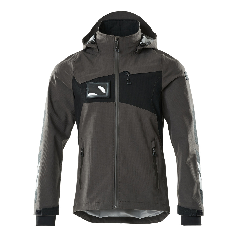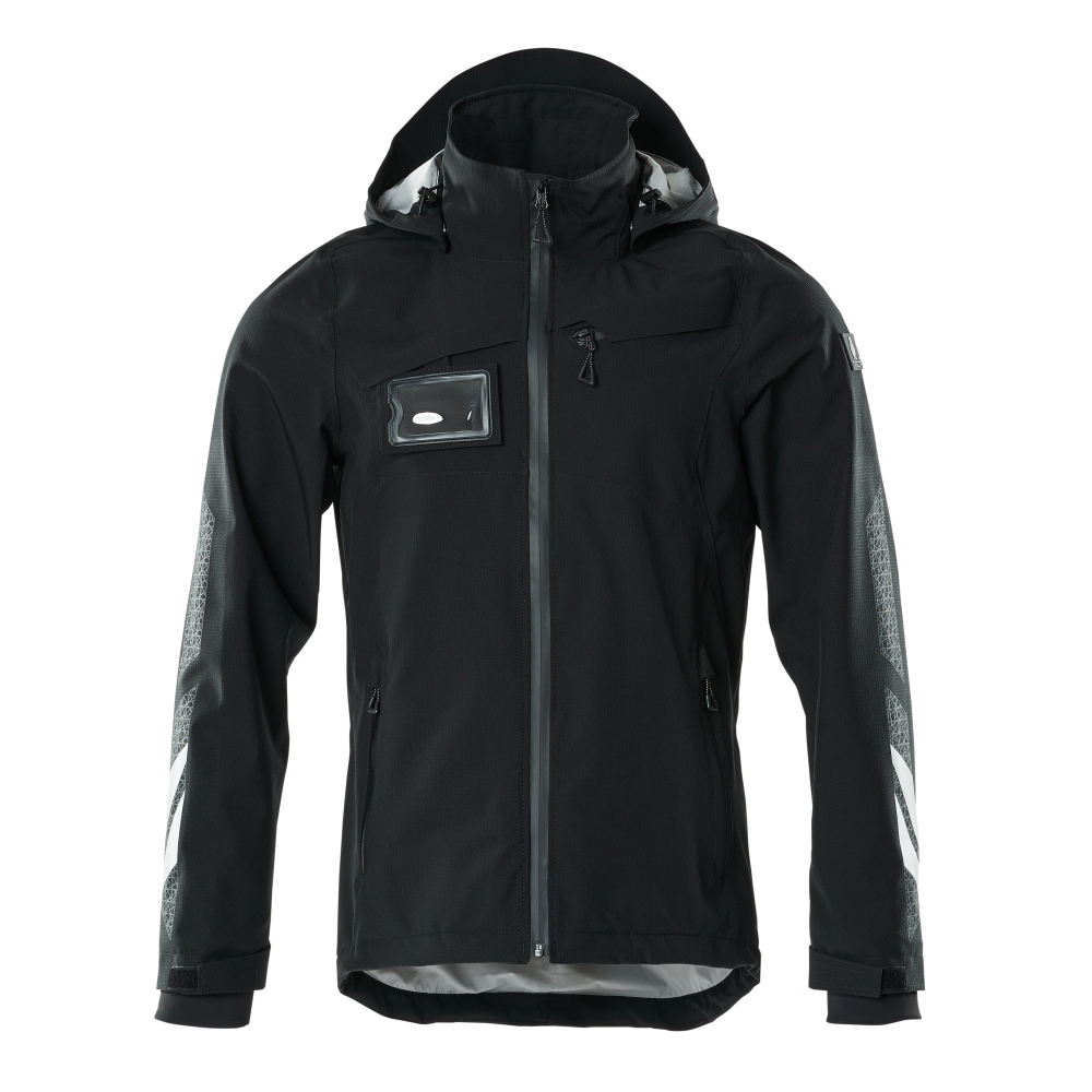 Metervaran är lätt. Vindtätt och vattenavvisande. Sömmarna är tejpade. Huvan är avtagbar, fodret har justerbart resårsnöre. Stängning med blixtlås och invändigt vindfång. Innerficka med blixtlås. ID-kortshållaren är avtagbar. Bröstficka med blixtlås. Framfickor med blixtlås. Resårkanten i nederkanten är reglerbar. Ribbstickning vid handleden (dold i vindskyddet). Med tryck och reflexer.