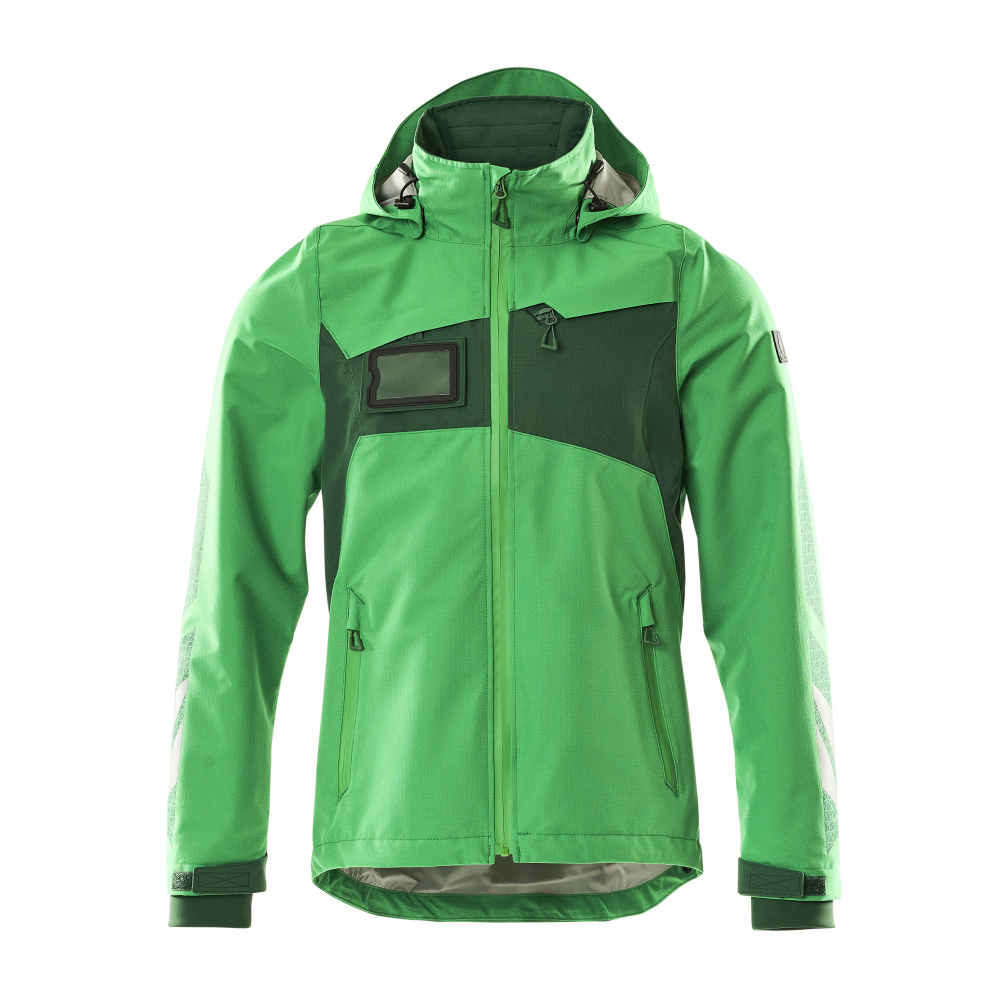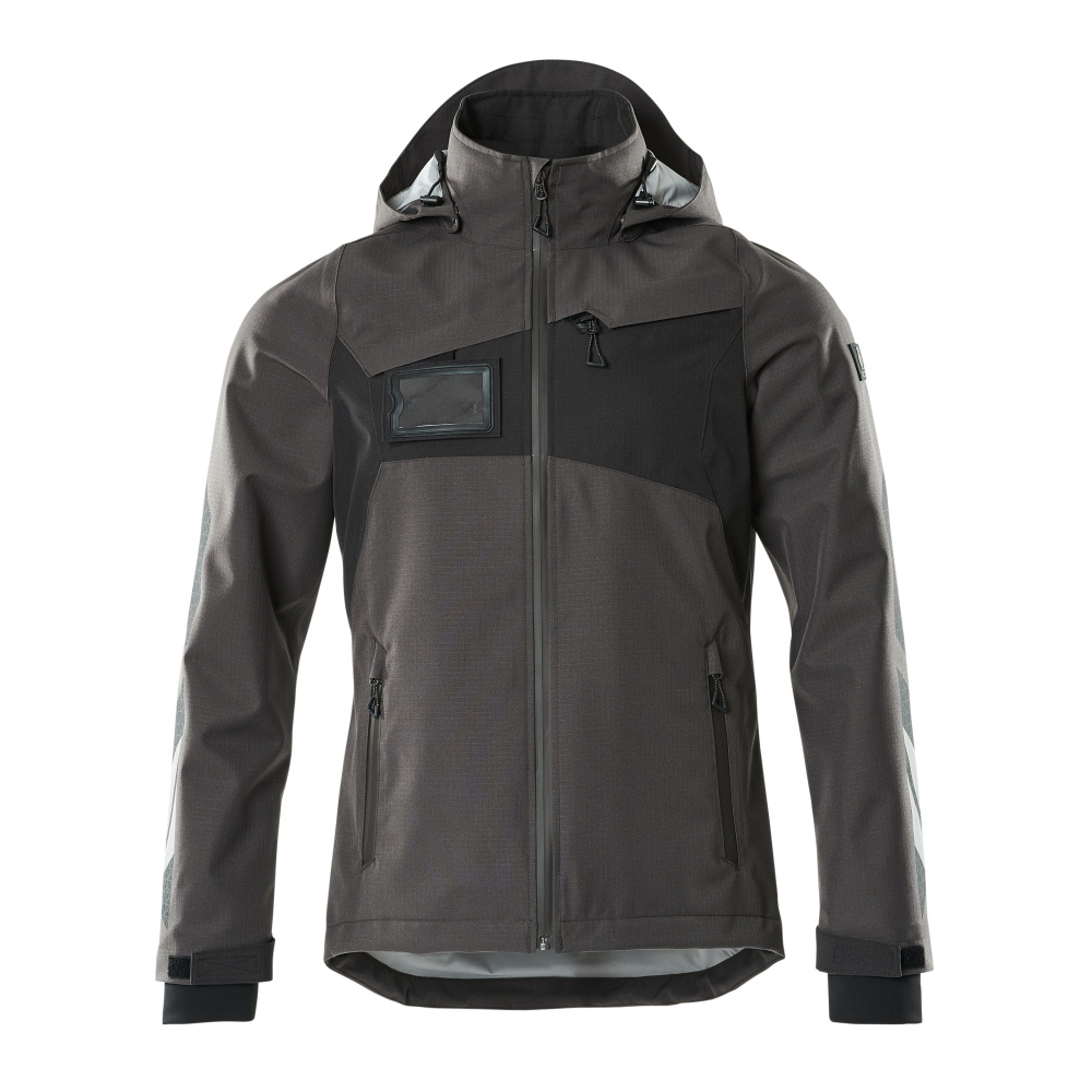 Andas, vind- och vattentät. Sömmarna är tejpade. Huvan är avtagbar, fodret har justerbart resårsnöre. Stängning med blixtlås och invändigt vindfång. Innerficka med blixtlås. ID-kortshållaren är avtagbar. Bröstficka med blixtlås. Framfickor med blixtlås. Resårkanten i nederkanten är reglerbar. Ärmar med CORDURA®-förstärkning. Ribbstickning vid handleden (dold i vindskyddet). Med tryck och reflexer.