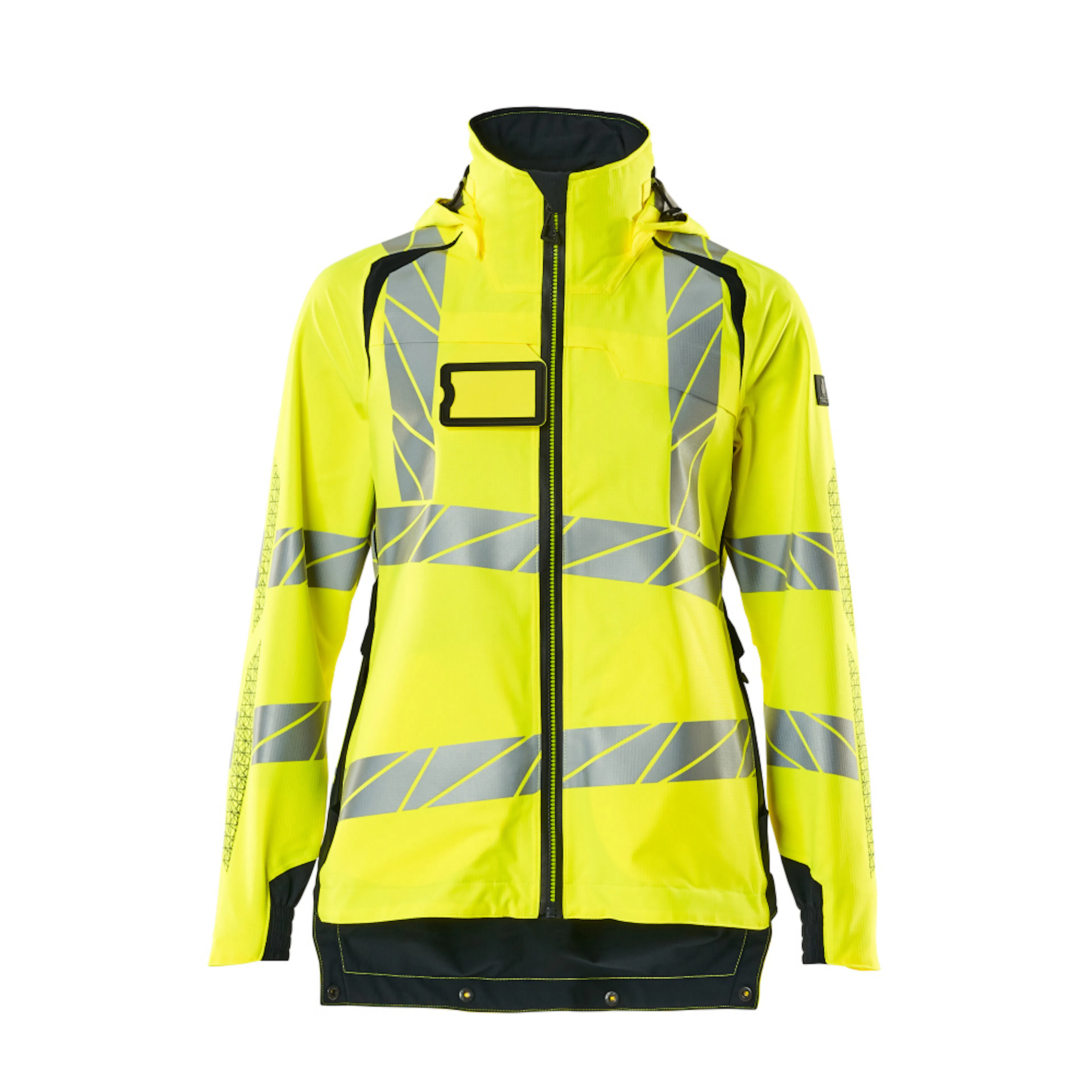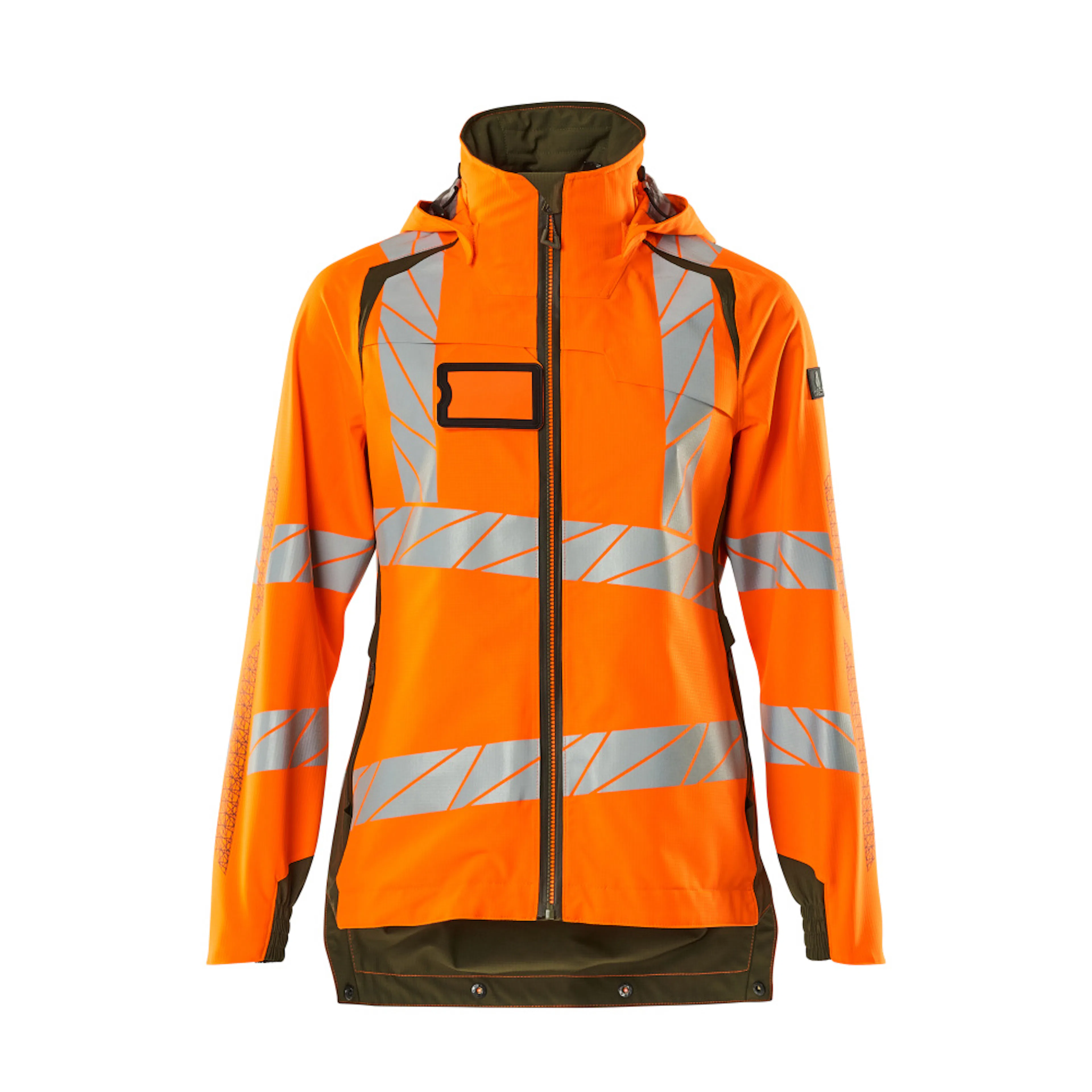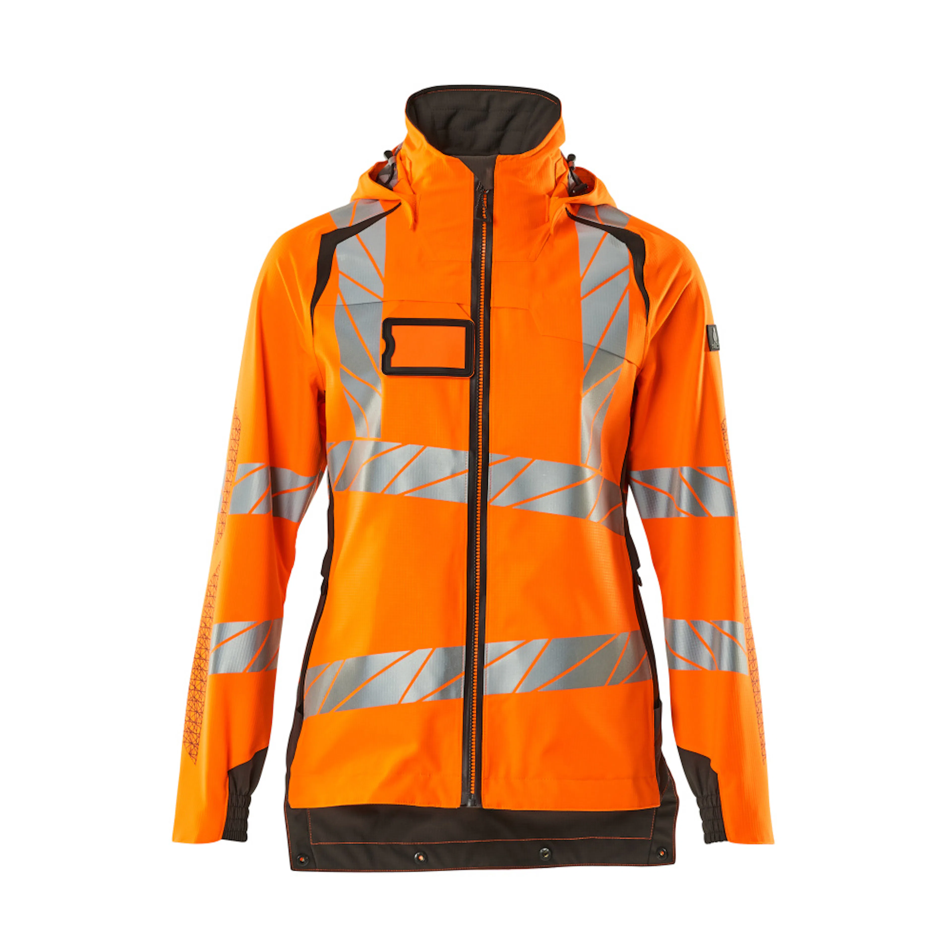 Lady passform. Fluorescerande med lodräta och sneda tvärgående reflexer. Tvåfärgat. Hög andningsbarhet samt vind- och vattentät. Sömmarna är tejpade. Huvan är avtagbar, fodret har justerbart resårsnöre. Reglerbar metalltråd i båda sidorna av huvan. Stängning med vattentätt blixtlås och invändigt vindfång. Innerfickor - två med blixtlås och en öppen nätficka. ID-kortshållaren är avtagbar. Bröstficka med vattentätt blixtlås. Framfickor med vattentäta blixtlås. Hög krage. Ribbstickning i nedre kanten på framsidan av jackan. Extra tyg nederst på ryggen kan vikas ned med knappar och ge extra längd baktill och därmed extra skydd mot väder och vind. Ribbstickning vid handleden (dold i vindskyddet). Resår vid handleden. Med tryckeffekter.