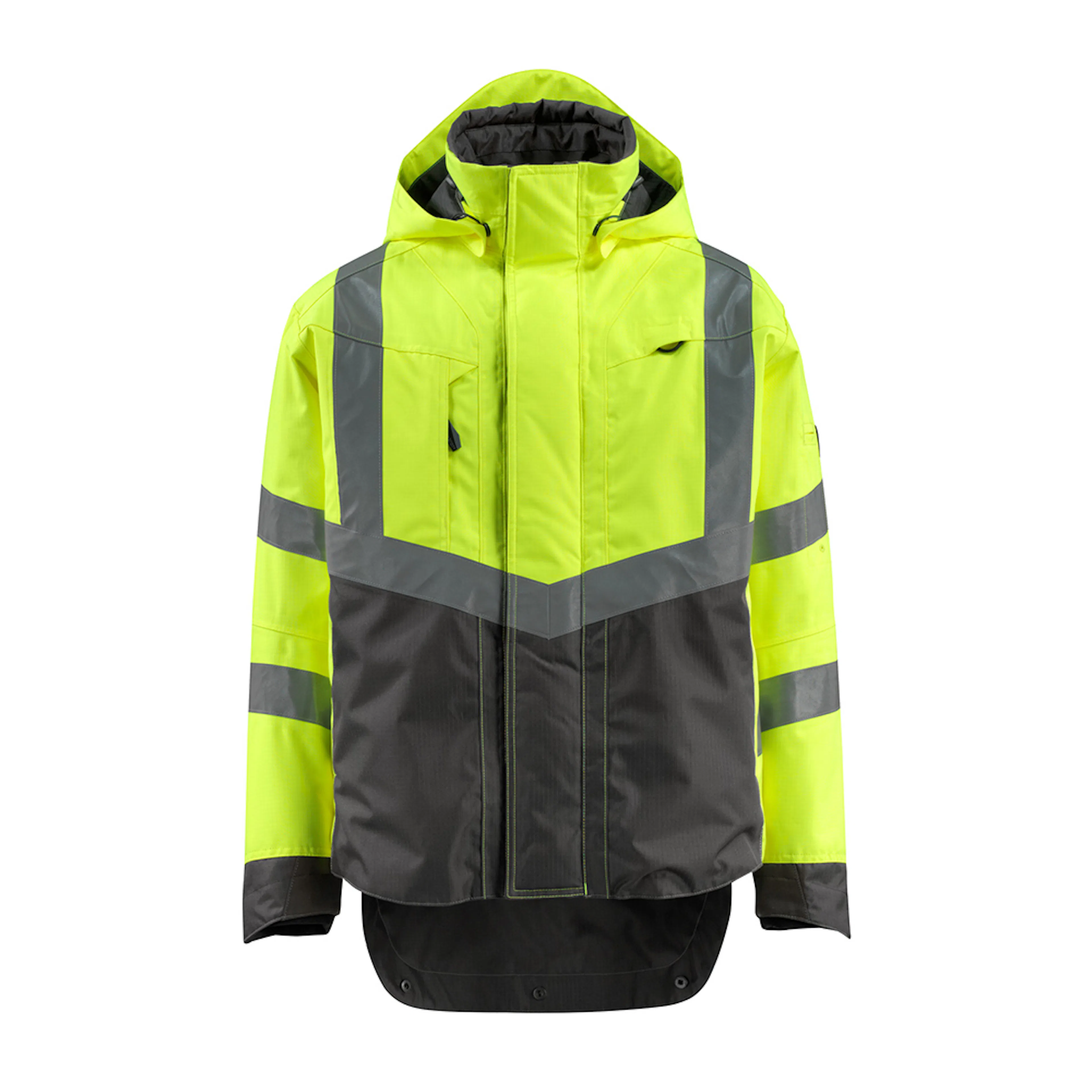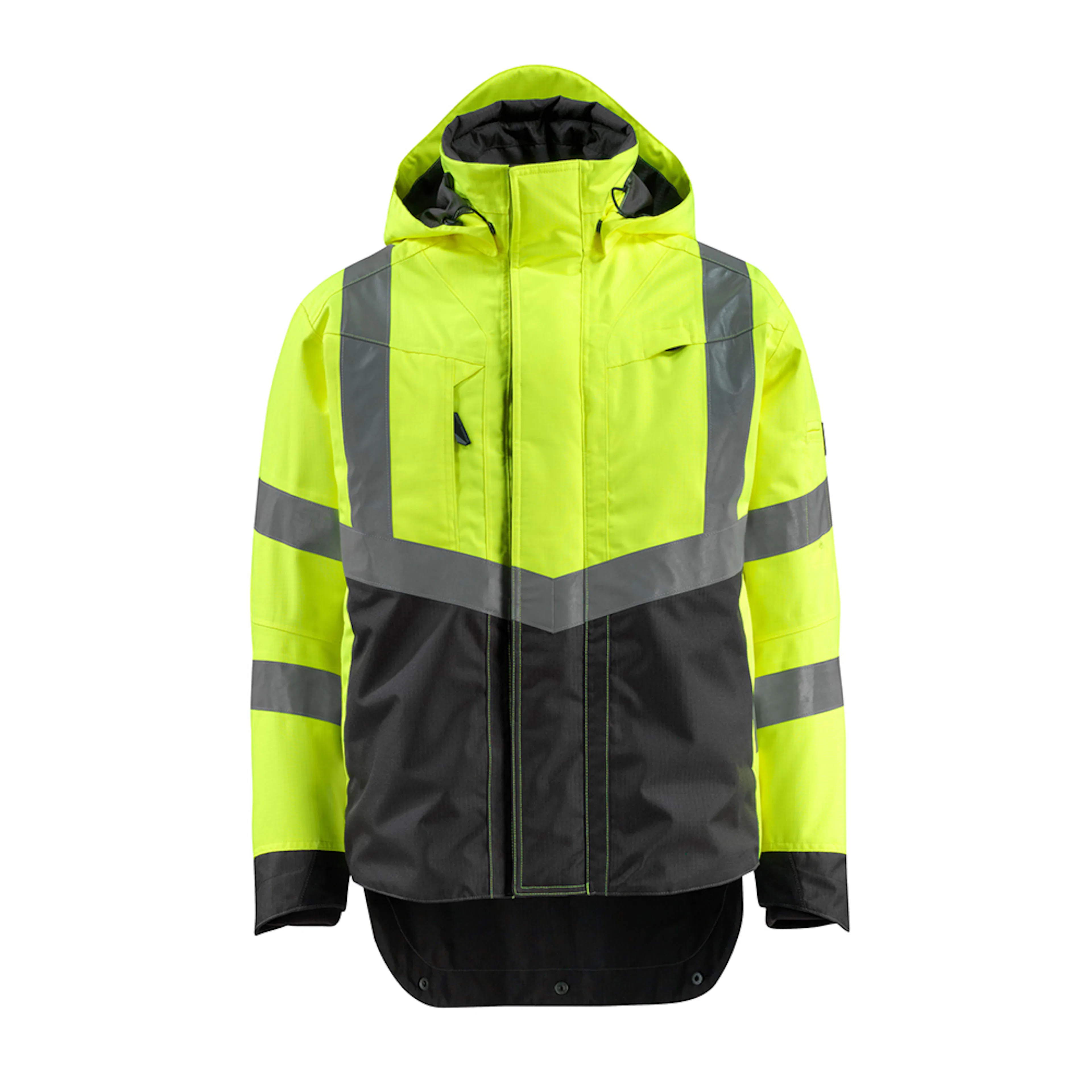 Fluorescerande med lodräta och sneda tvärgående reflexer. Tvåfärgat. Andas, vind- och vattentät. Sömmarna är tejpade. Foder i nätmaterial. Huvan är löstagbar, fodrad och har justerbart elastiskt snöre så att den kan passa utanpå en hjälm. Reglerbar metalltråd i båda sidorna av huvan. Nät med ventilation under ärmarna - öppnas med blixtlås. Hög krage. Innerkrage av resår. Vattentät pennficka på ärmen. Stängning med blixtlås och vindskydd med tryckknappar. Innerfickor med blixtlås under vindflik – den ena är särskilt utformad för telefoner, med hål till kabel och headset och öglor för att hålla kabeln på plats. Ficka med blixtlås under vindflik med plats för en 7-tums surfplatta. Extra tyg nederst på ryggen kan vikas ned med knappar och ge extra längd baktill och därmed extra skydd mot väder och vind. Bröstficka med blixtlås. D-ring. Ergonomiskt utformade ärmar ger god rörelsefrihet. Ribbvirkat vid handleden sluter åt bra och håller ute kylan. Manschetter med CORDURA®-förstärkning och knappknäppning. Framfickor med blixtlås.