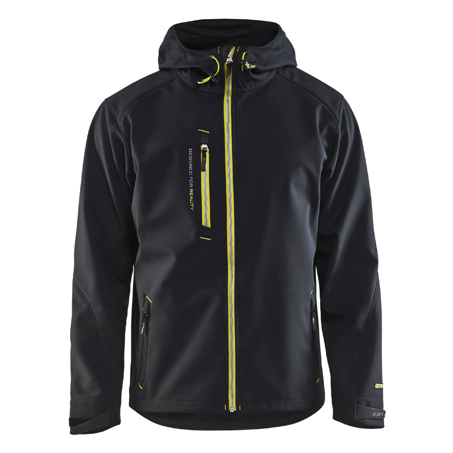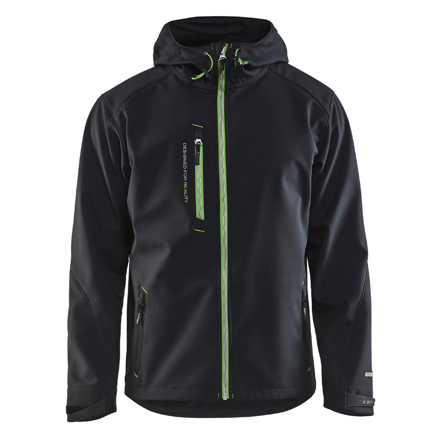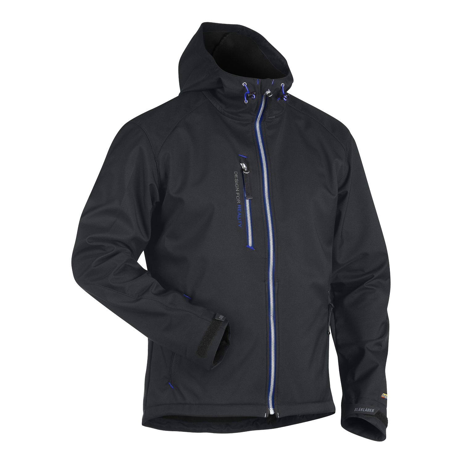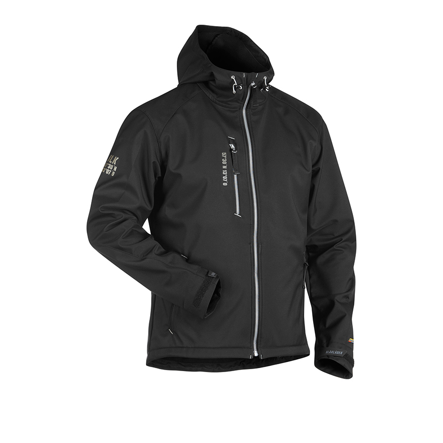 Flexibel softshelljacka från Blåkläder i stretchigt material som är vind- och vattenavvisande. Jackan har fast, justerbar luva och en bröstficka samt två sidfickor med blixtlås.