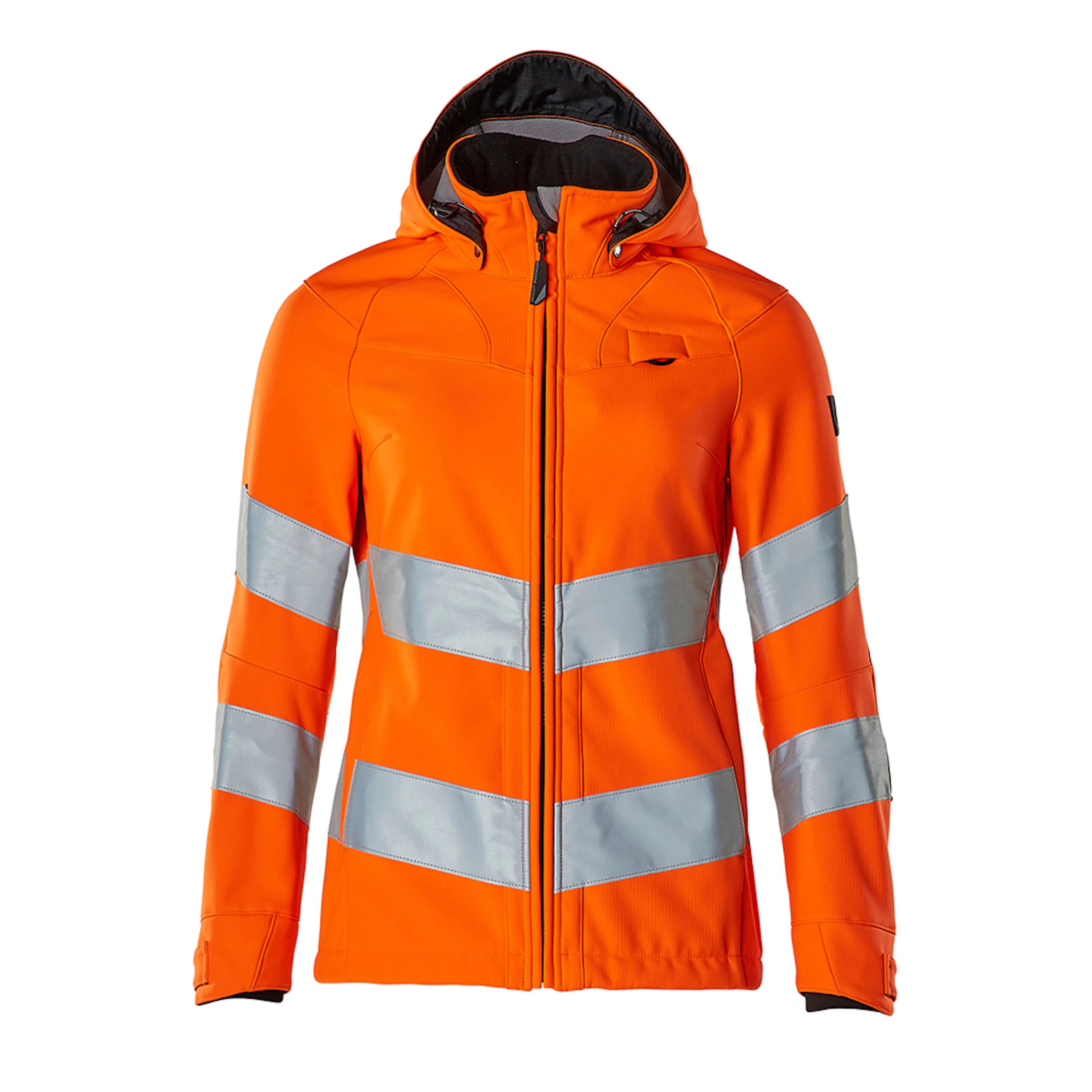 Lady passform. Fluorescerande med sneda tvärgående reflexer. Enfärgade. Andas, vindtät och vattenavvisande. Fleece på insidan. Stängning med blixtlås och invändigt vindfång. Huvan är avtagbar, fodret har justerbart resårsnöre. Hög krage. Innerfickor. Ryggen är förlängd. D-ring. Ergonomiskt utformade ärmar ger god rörelsefrihet. Framfickor med blixtlås. Ribbstickning vid handleden (dold i vindskyddet) med kardborrejustering.