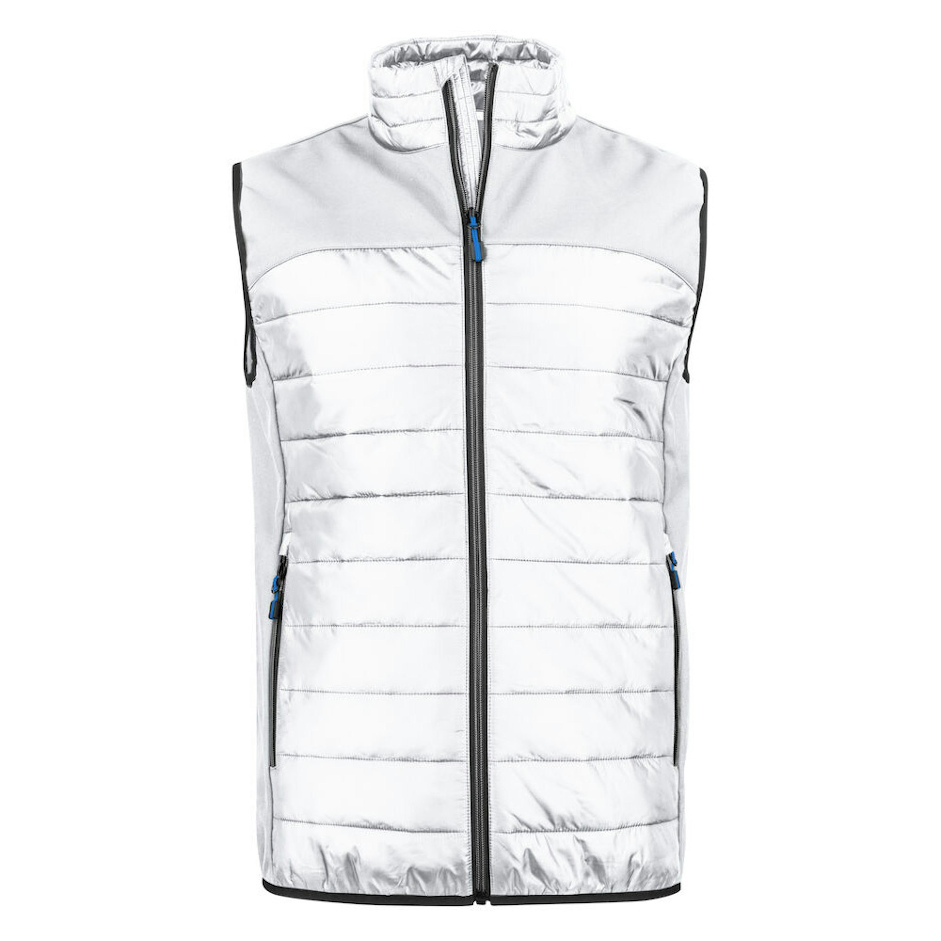 Softshell/ lättvikts väst. Oket, sidopaneler fram & bak av softshell (tyg 1). Bål, fram & bak av vadderat lättvikts material (tyg 2).
