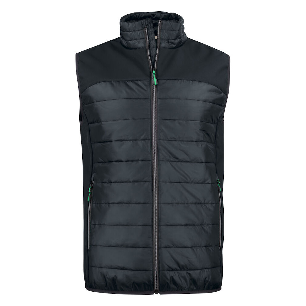 Softshell/ lättvikts väst. Oket, sidopaneler fram & bak av softshell (tyg 1). Bål, fram & bak av vadderat lättvikts material (tyg 2).
