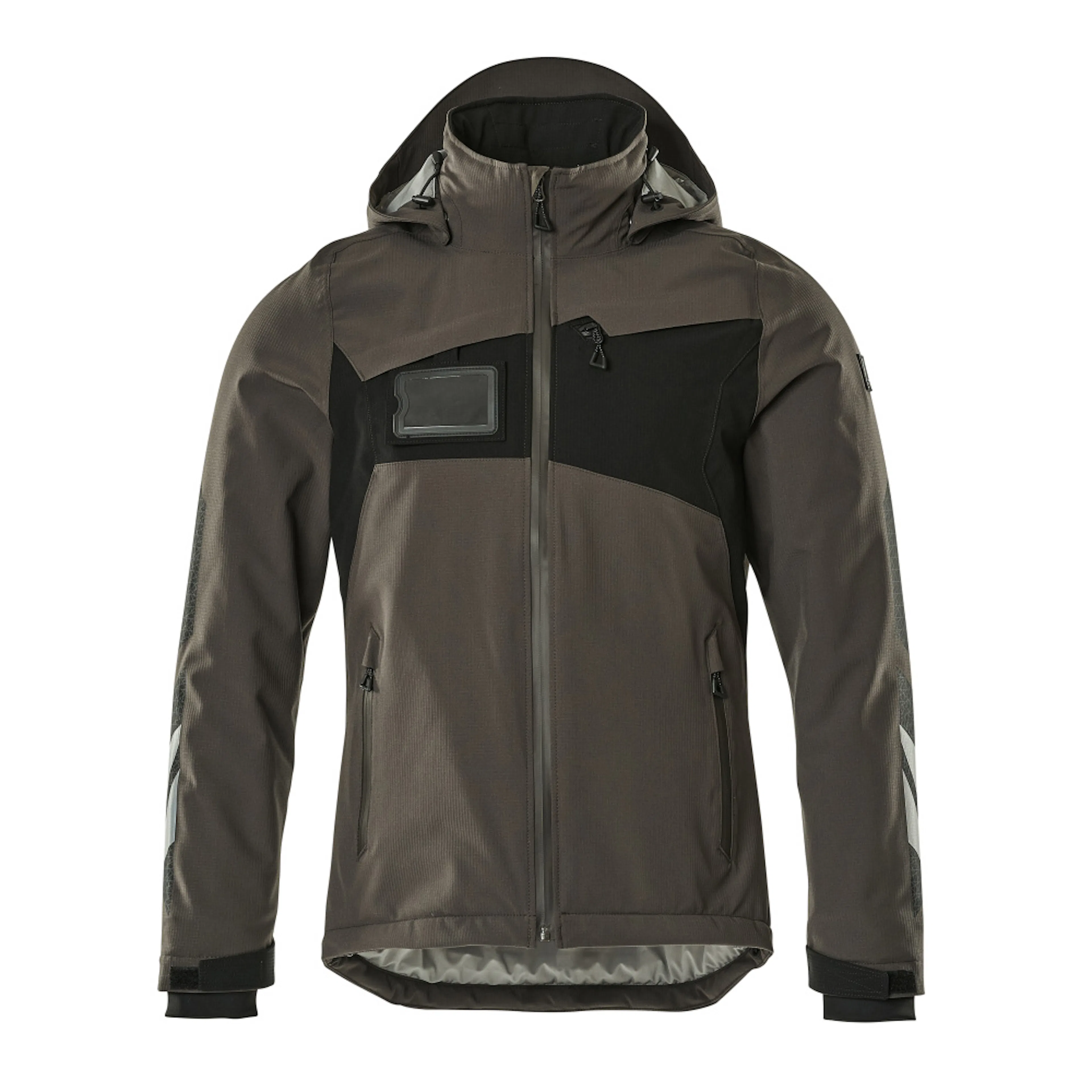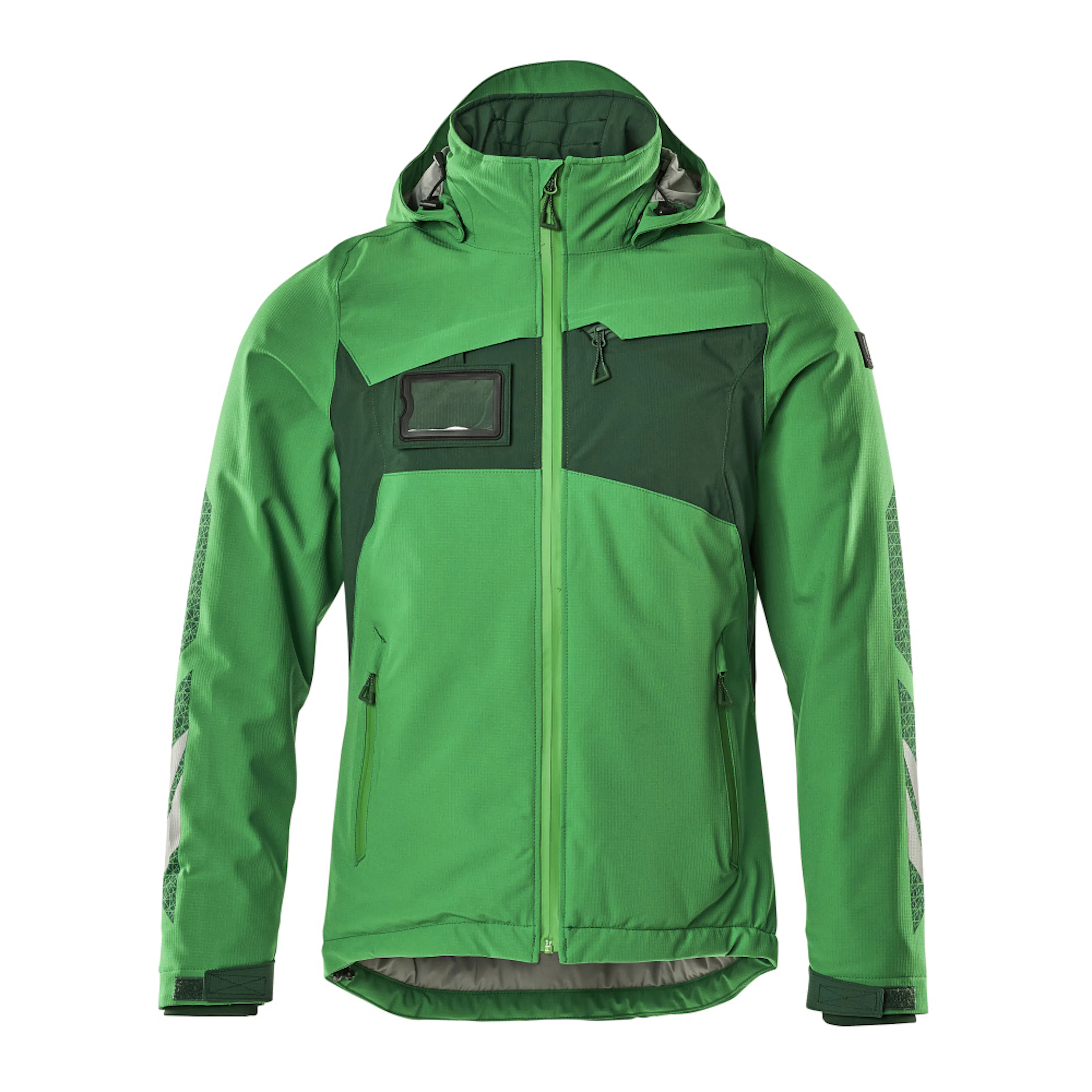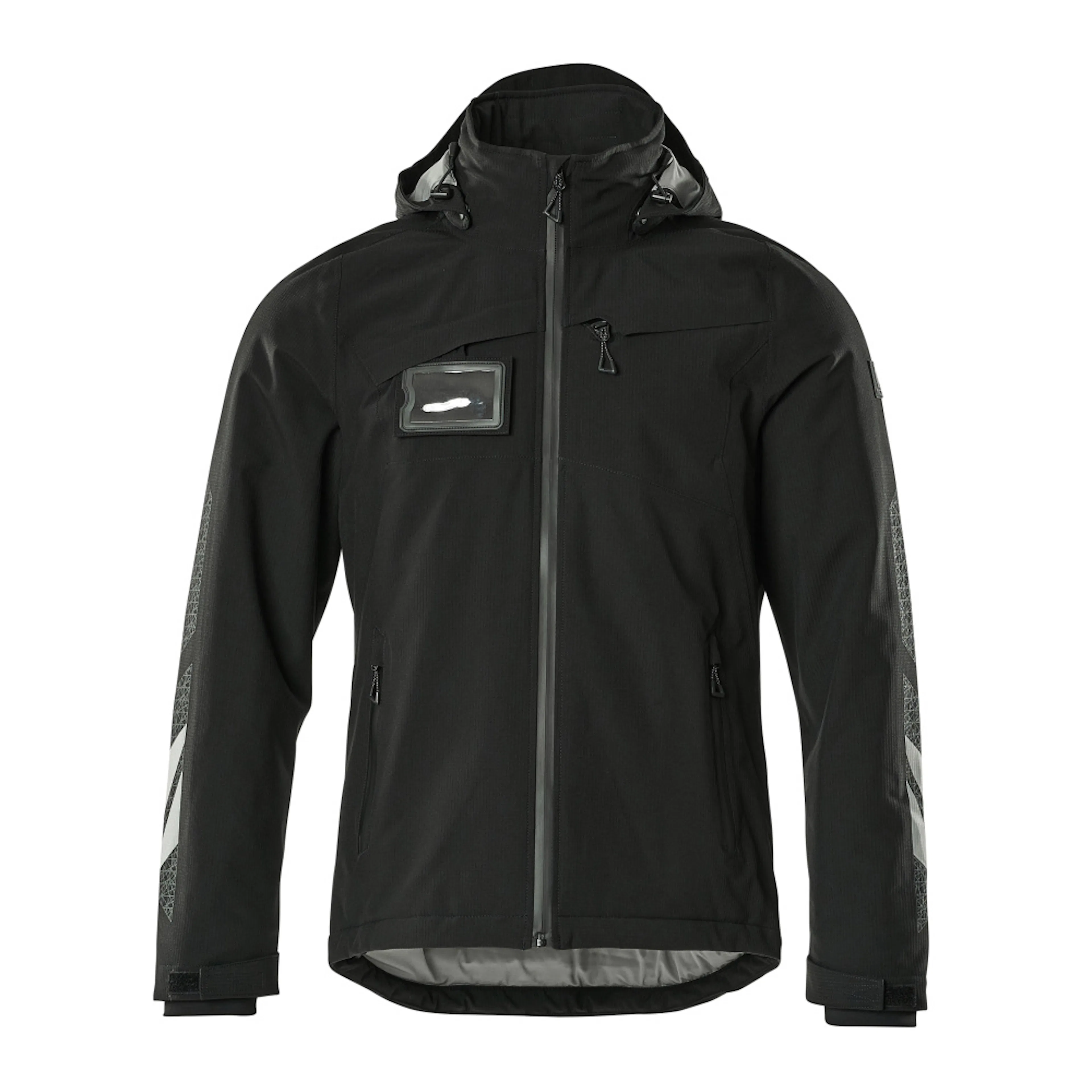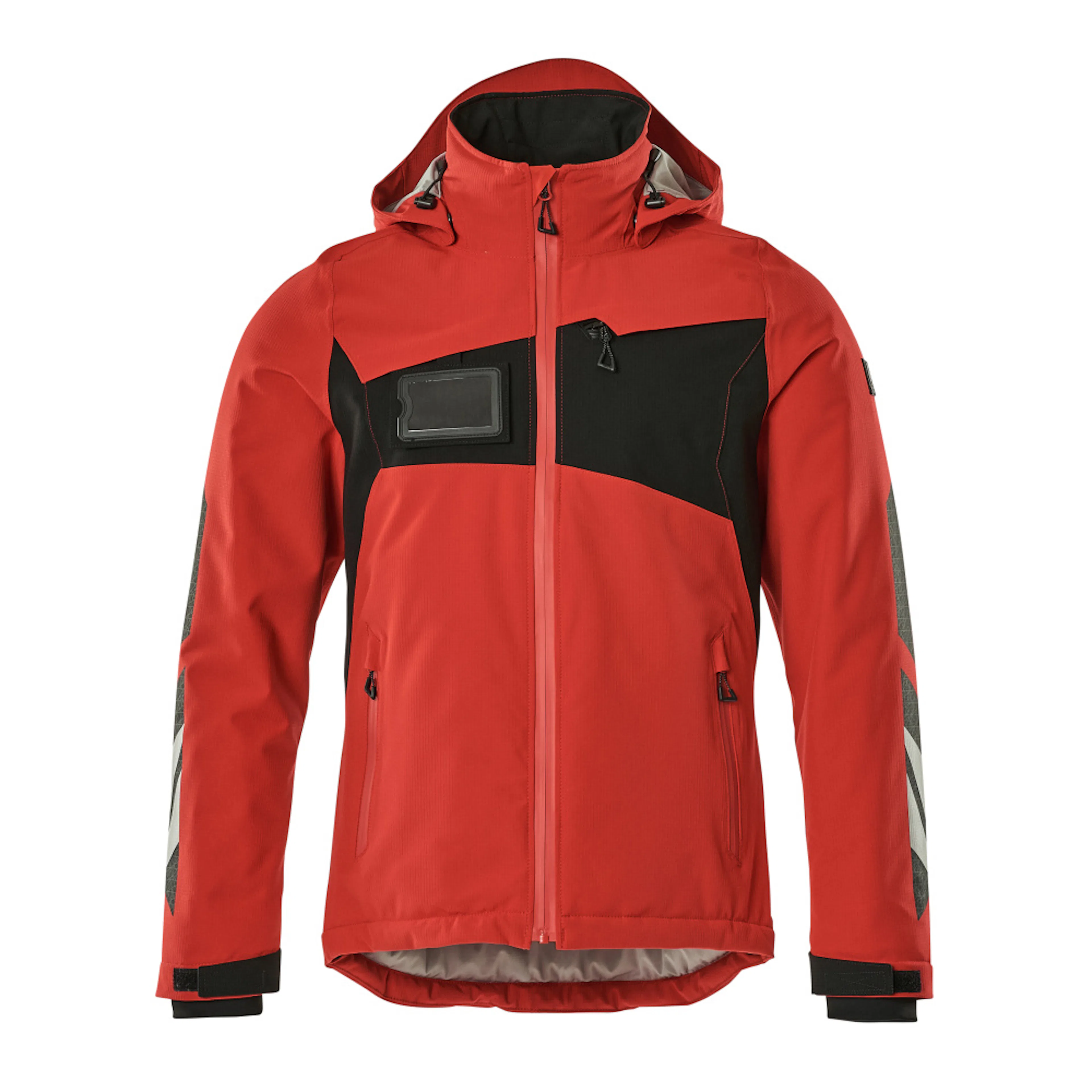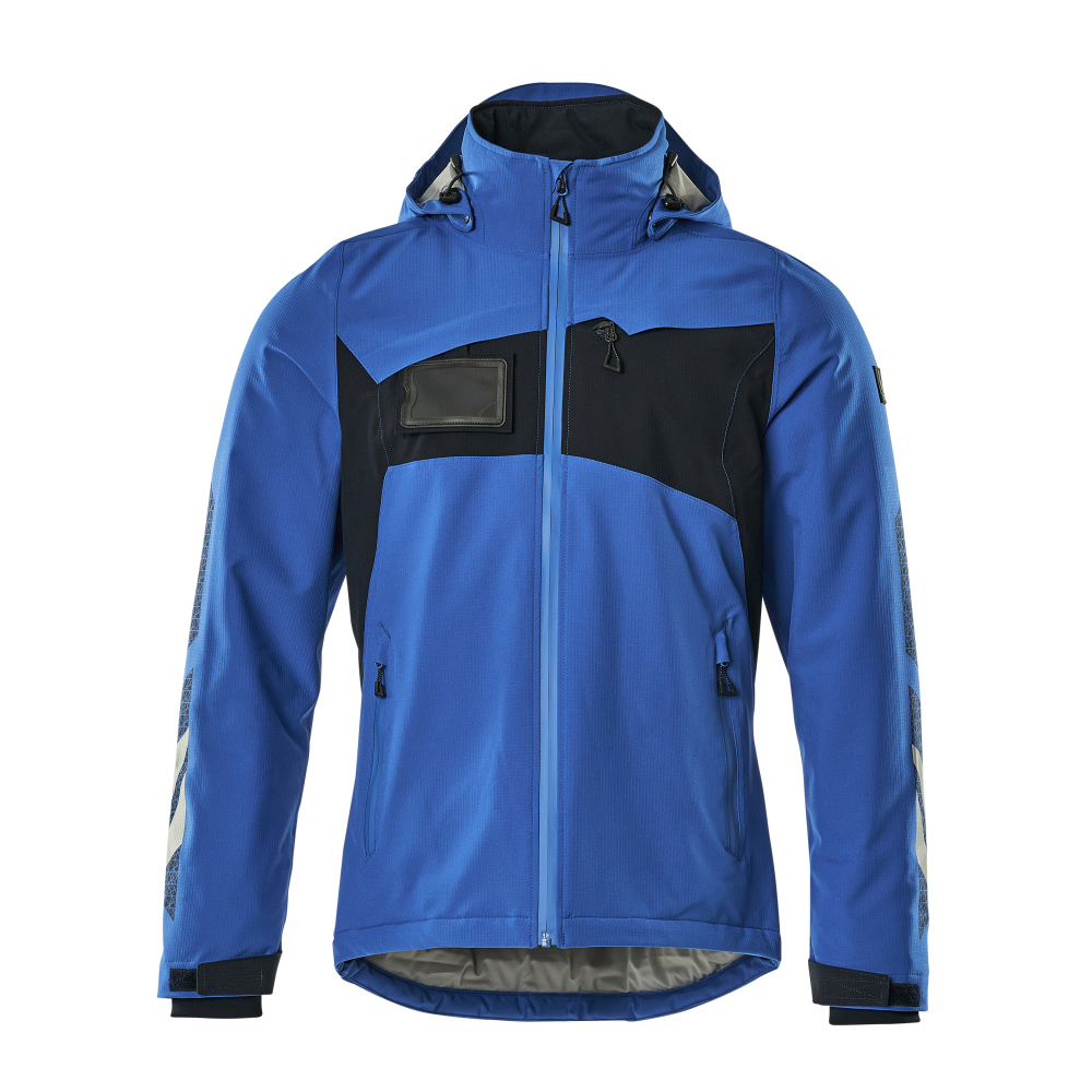 Metervaran är lätt. Sömmarna är tejpade. Andas, vind- och vattentät. Med CLIMASCOT® Lightweight Insulation. Huvan är avtagbar, fodret har justerbart resårsnöre. Stängning med blixtlås och invändigt vindfång. Innerficka med blixtlås. ID-kortshållaren är avtagbar. Bröstficka med blixtlås. Framfickor med blixtlås. Resårkanten i nederkanten är reglerbar. Blixtlås nederst på ryggen, invändigt, för användning vid tryck/broderi. Ribbstickning vid handleden (dold i vindskyddet). Med tryck och reflexer.