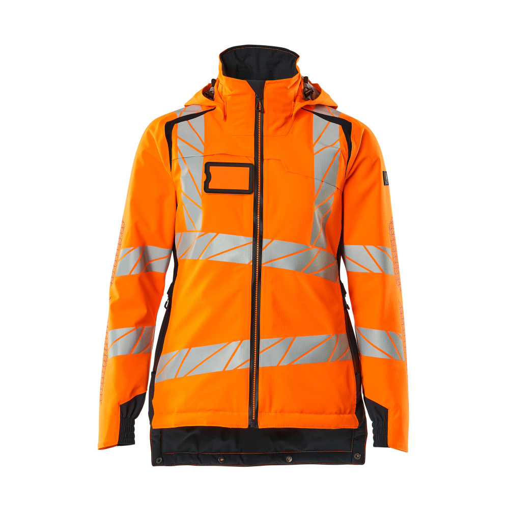 Lady passform. Fluorescerande med lodräta och sneda tvärgående reflexer. Hög andningsbarhet samt vind- och vattentät. Med CLIMASCOT® Lightweight Insulation. Tvåfärgat. Sömmarna är tejpade. Huvan är avtagbar, fodret har justerbart resårsnöre. Stängning med vattentätt blixtlås och invändigt vindfång. Innerfickor - två med blixtlås och en öppen nätficka. ID-kortshållaren är avtagbar. Bröstficka med vattentätt blixtlås. Framfickor med vattentäta blixtlås. Hög krage. Ribbstickning i nedre kanten på framsidan av jackan. Extra tyg nederst på ryggen kan vikas ned med knappar och ge extra längd baktill och därmed extra skydd mot väder och vind. Resår vid handleden. Blixtlås nederst på ryggen, invändigt, för användning vid tryck/broderi. Med tryckeffekter.