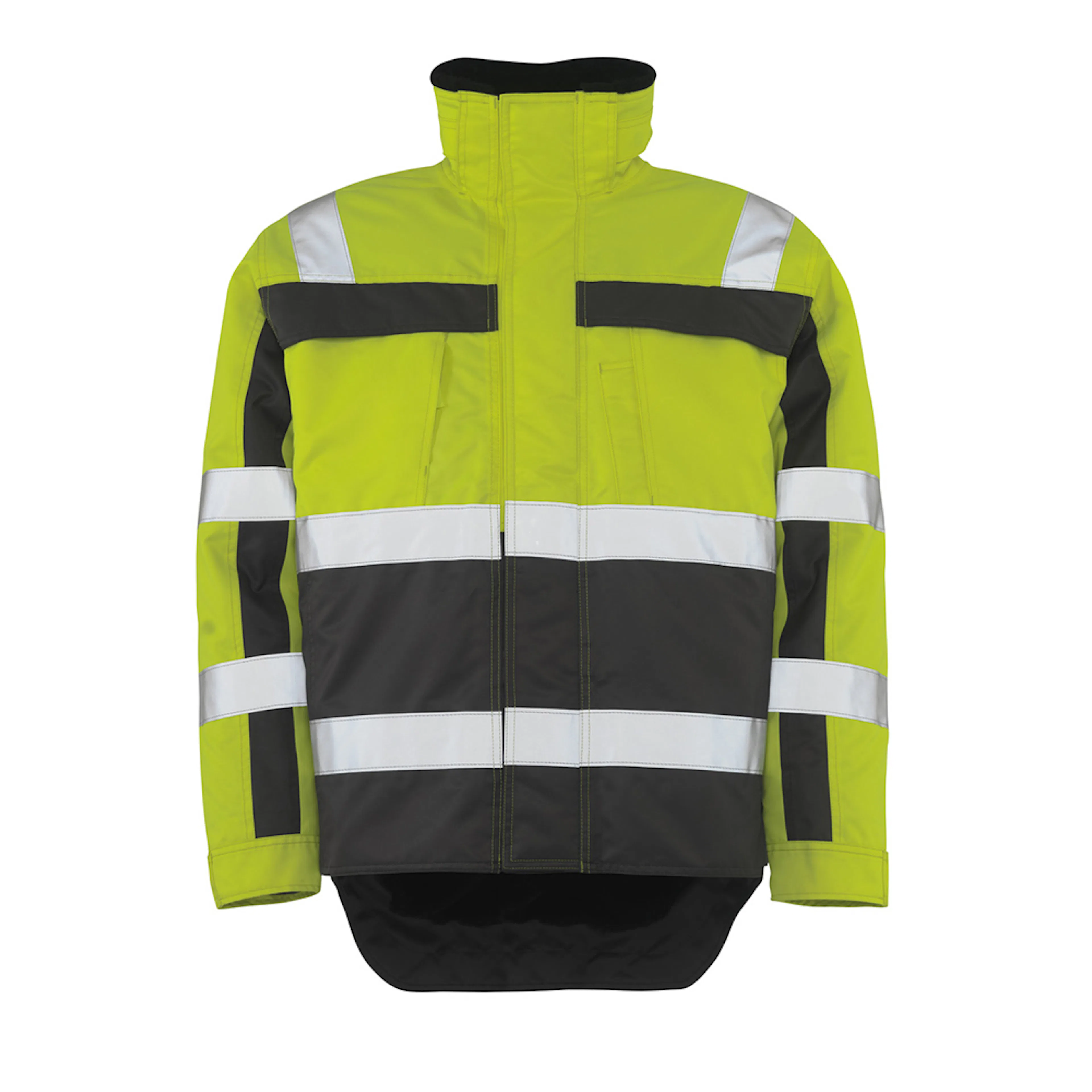 Fluorescerande och med lod- och vågräta reflexer. Tvåfärgat. Andas, vind- och vattentät. Sömmarna är tejpade. Pälsfoder på fram- och bakstycke. Quiltfoder i ärmarna. Ryggen är förlängd. Stängning med blixtlås, vindskydd och dolda tryckknappar. Blixtlåsficka under vindskydd. Bröstfickor med lock och kardborreband. Telefonbröstficka med blixtlås. D-ring. Pennficka. Fickor på framstycket. Innerficka med kardborreband. Ribbstickning (dold i vindskyddet) och tryckknappar vid handleden. Tryckknappar i nederkanten. Blixtlås nederst på ryggen, invändigt, för användning vid tryck/broderi. Tryckknappar till huva.