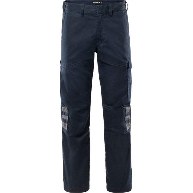 Delvis återvunnet material / Mekanisk stretch / Ribbstickade stretchpartier i midjan / Dold knapp fram / 2 framfickor / 2 bakfickor / Tumstocksficka och verktygsficka / Benficka med hälla för id-kortshållare under lock med dold tryckknapp / Förböjda knän / Benlängden kan förlängas 5 cm / Godkänd enligt EN 13758-2 UPF 40+ UV-skydd / Testad för industritvätt enligt ISO 15797 / OEKO-TEX®-certifierad.