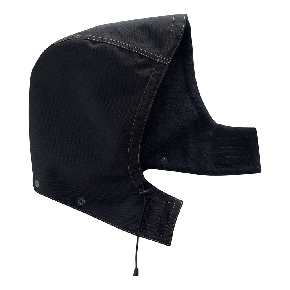 Andas, vind- och vattentät. Sömmarna är tejpade. Foder av fleece. Den elastiska snörningen i framkanten är justerbar. Kardborreband vid hakan. Kontrastsömmarna är orange. Sätts på med tryckknappar. Passar till MASCOT® Tavira.