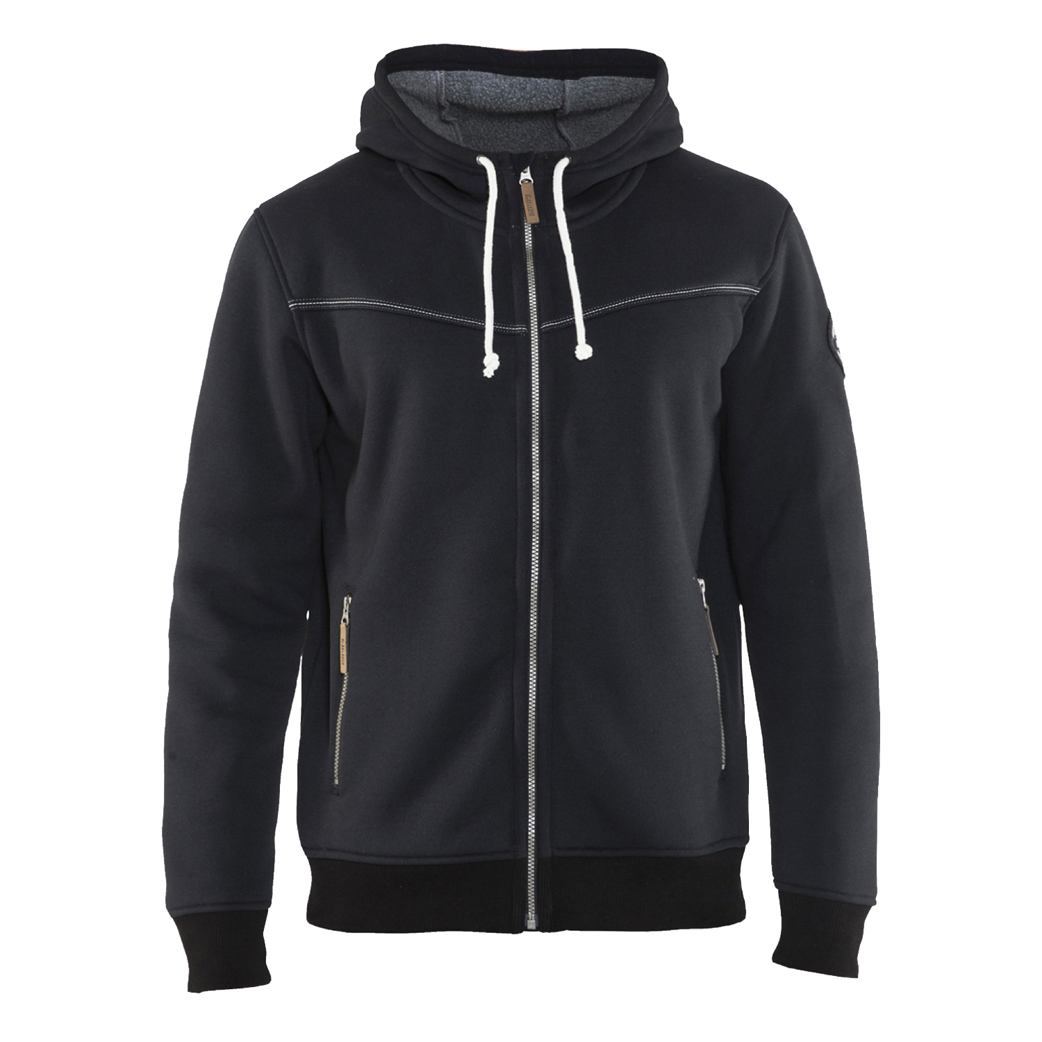 Huvtröja från Blåkläder med påsytt märke på ärmen, invändig slå med fleece och framfickor med blixtlås.
