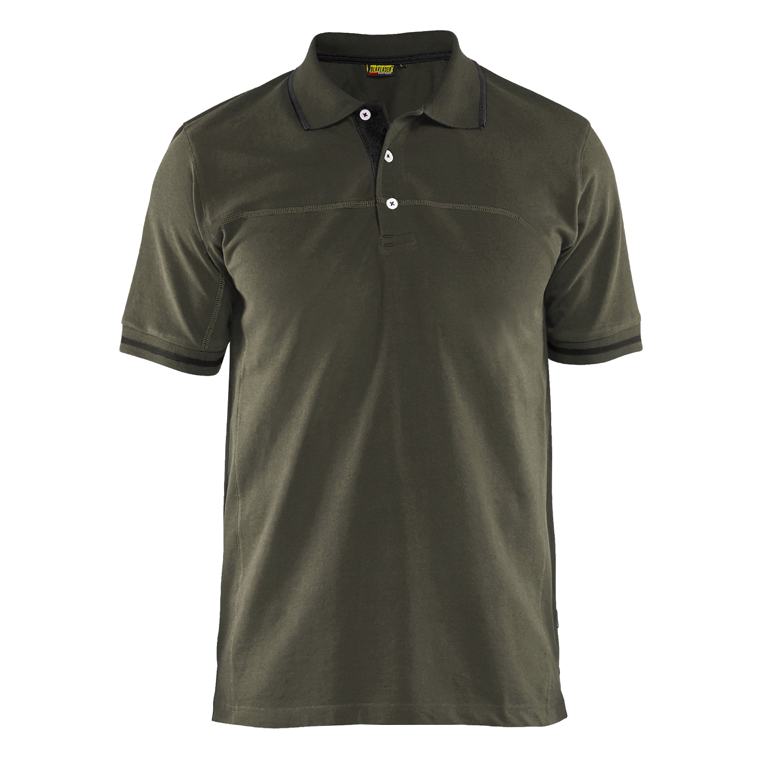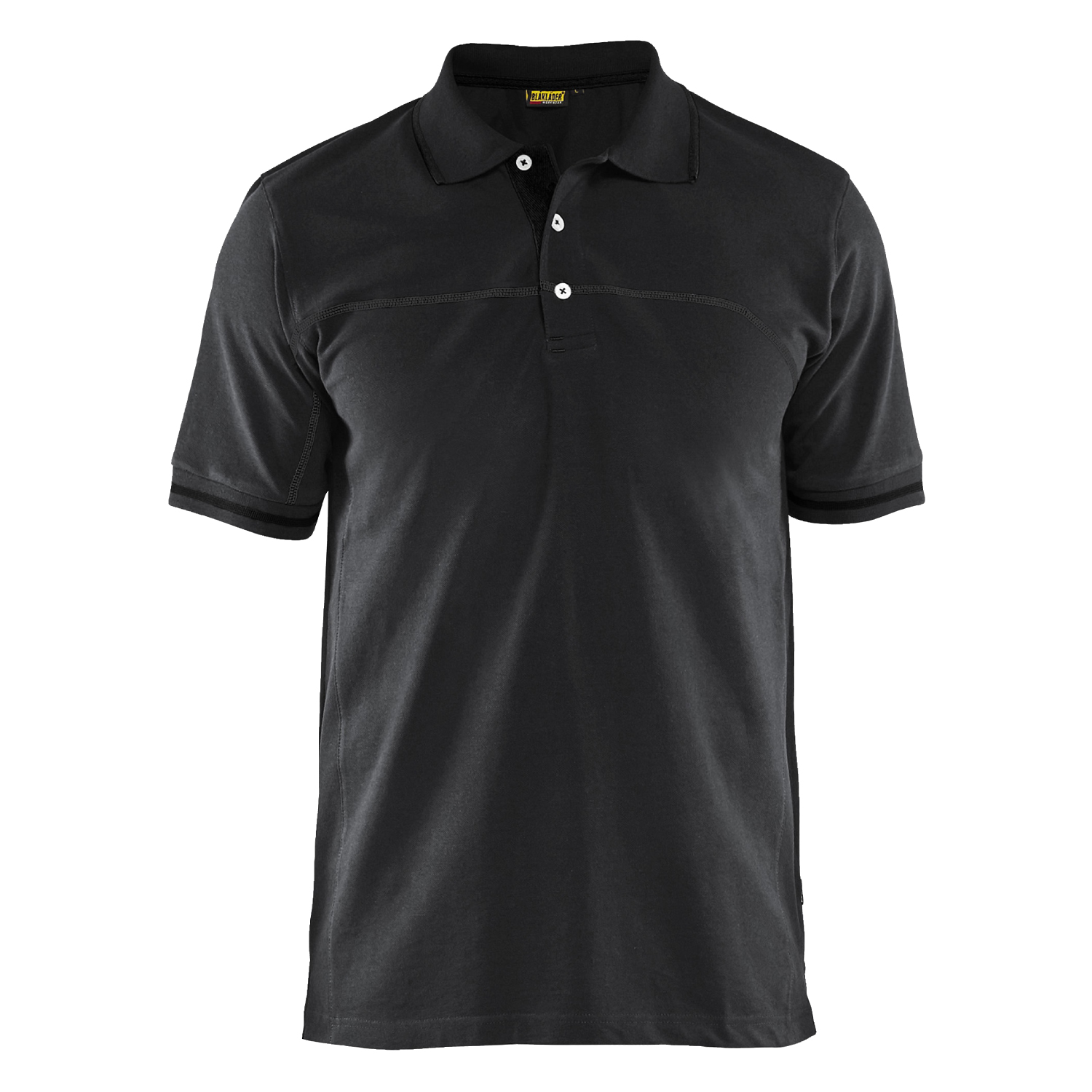 Pikétröja från Blåkläder som är förstärkt i axel- och nacksöm. Tröjan har halsöppning med knappar och med slits i sida.