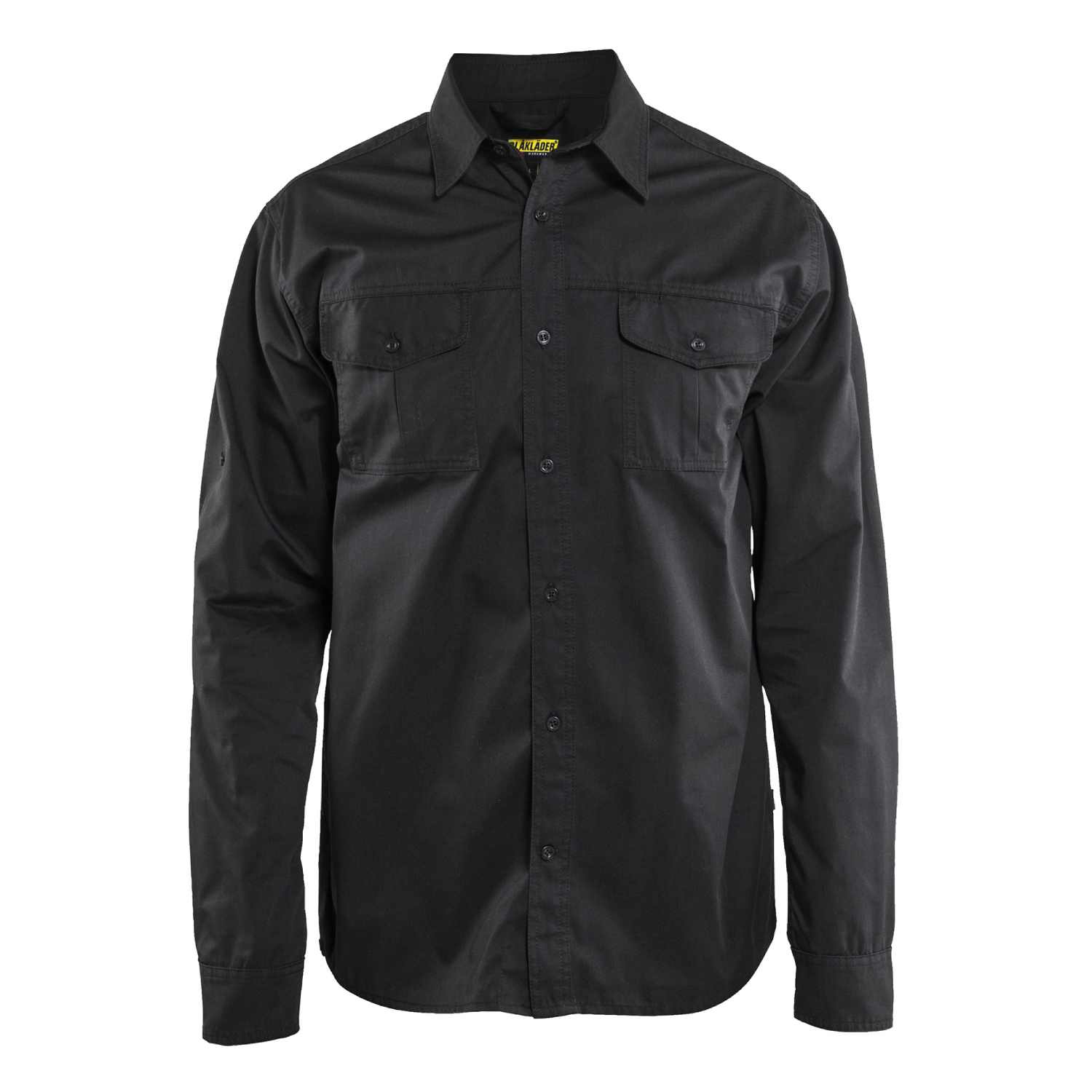 Långärmad twillskjorta från Blåkläder i loose fit-modell. Skjortan har slejf med knapp för att hålla kvar uppvik, mManschetter i ärmavslut, plastknappar och bröstficka med lock och pennficka.