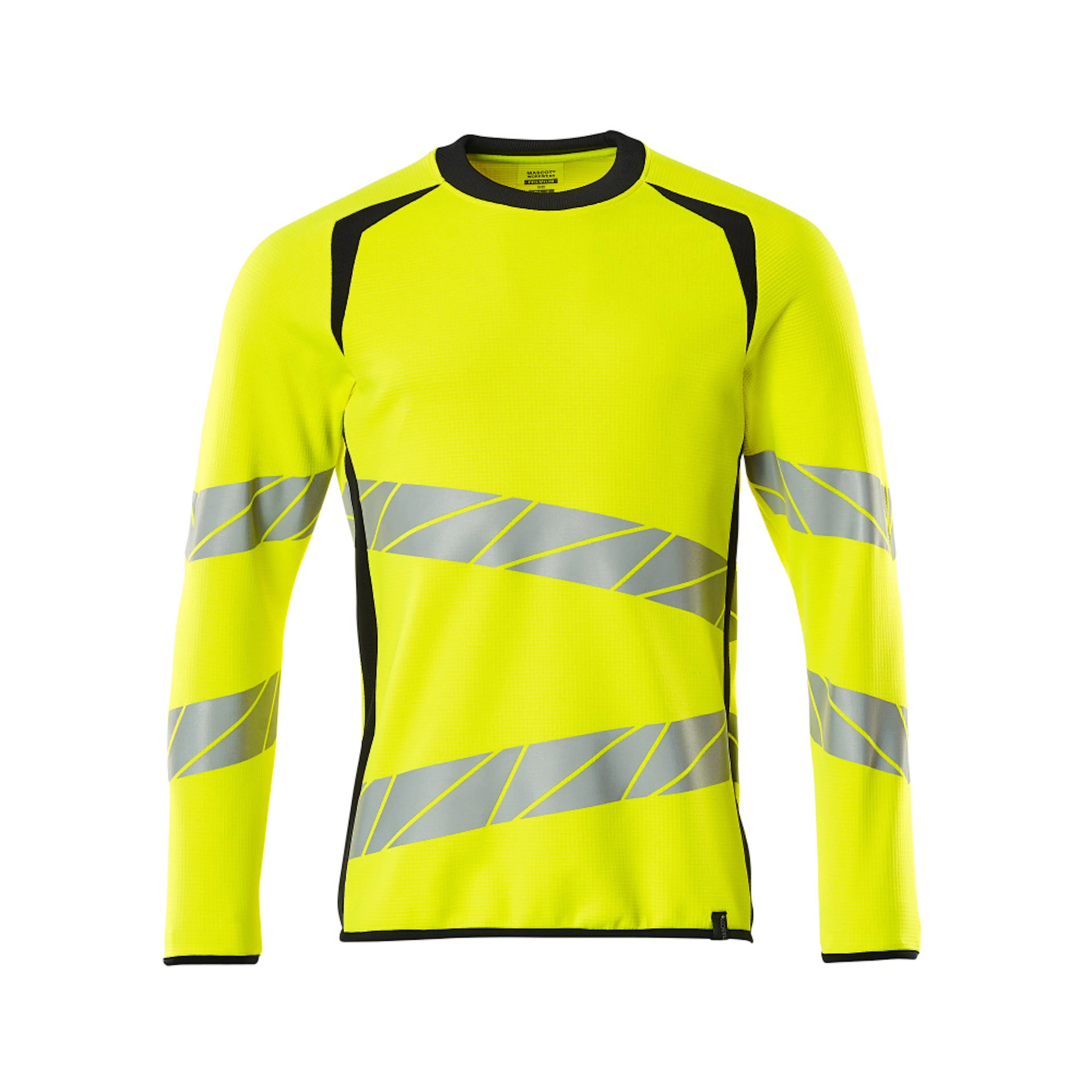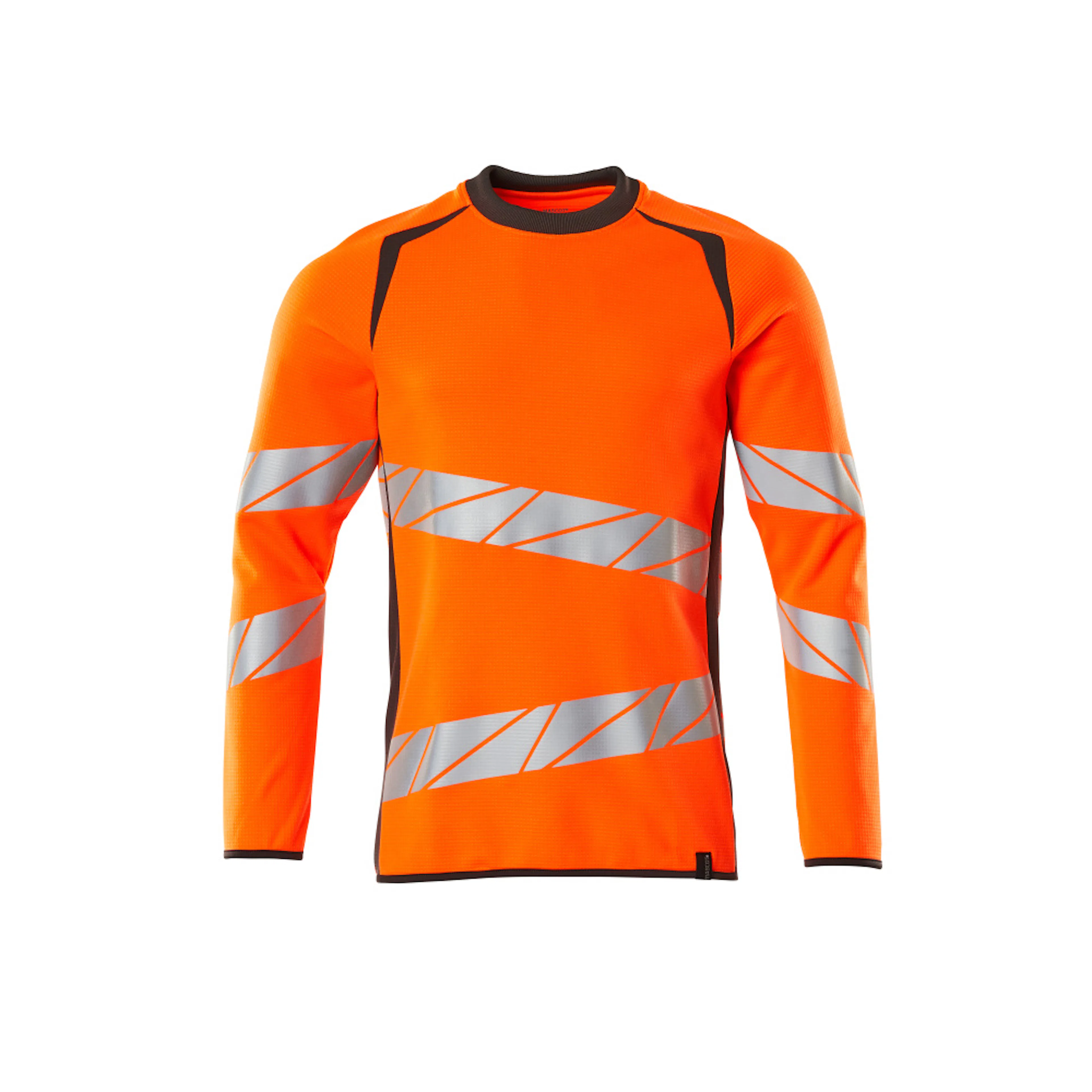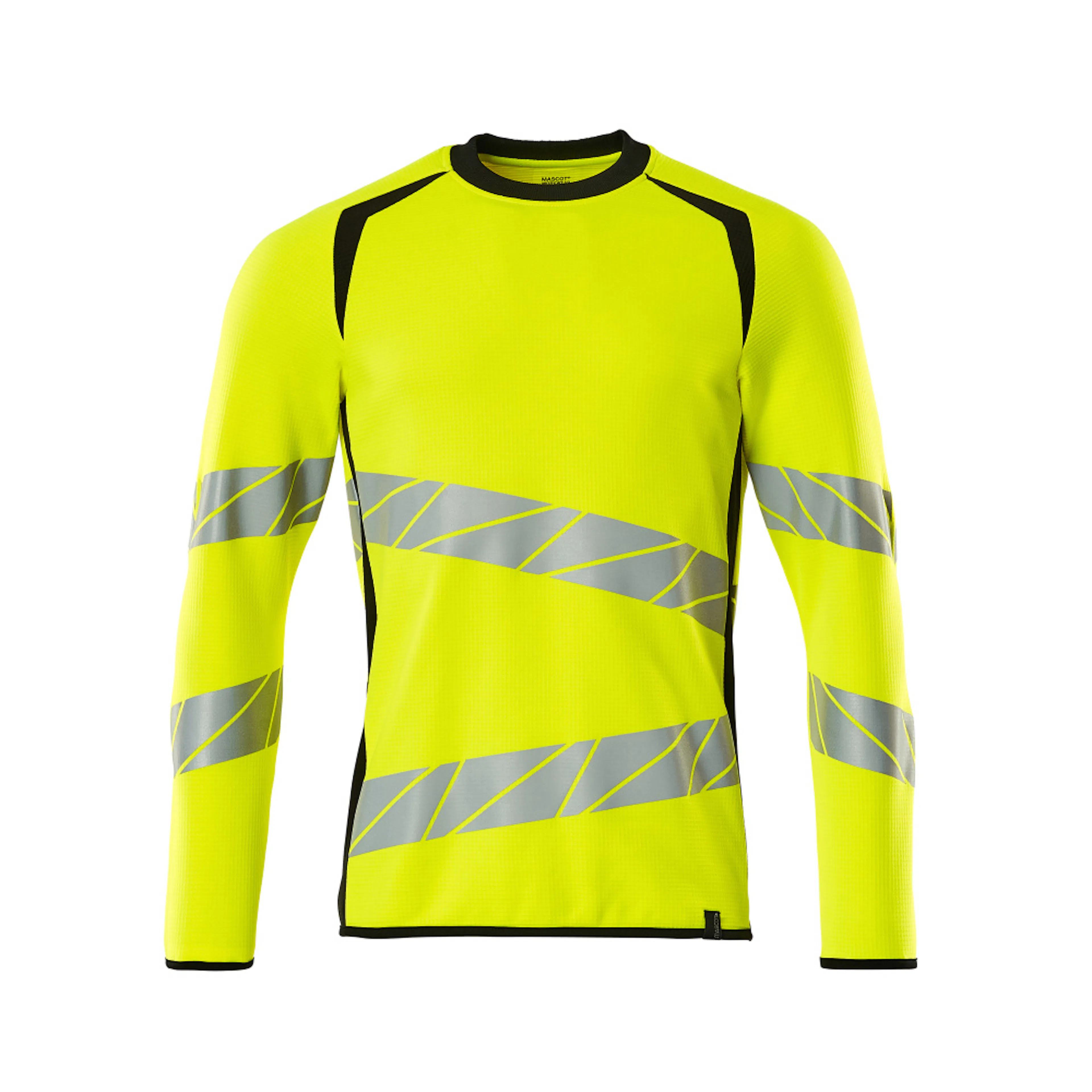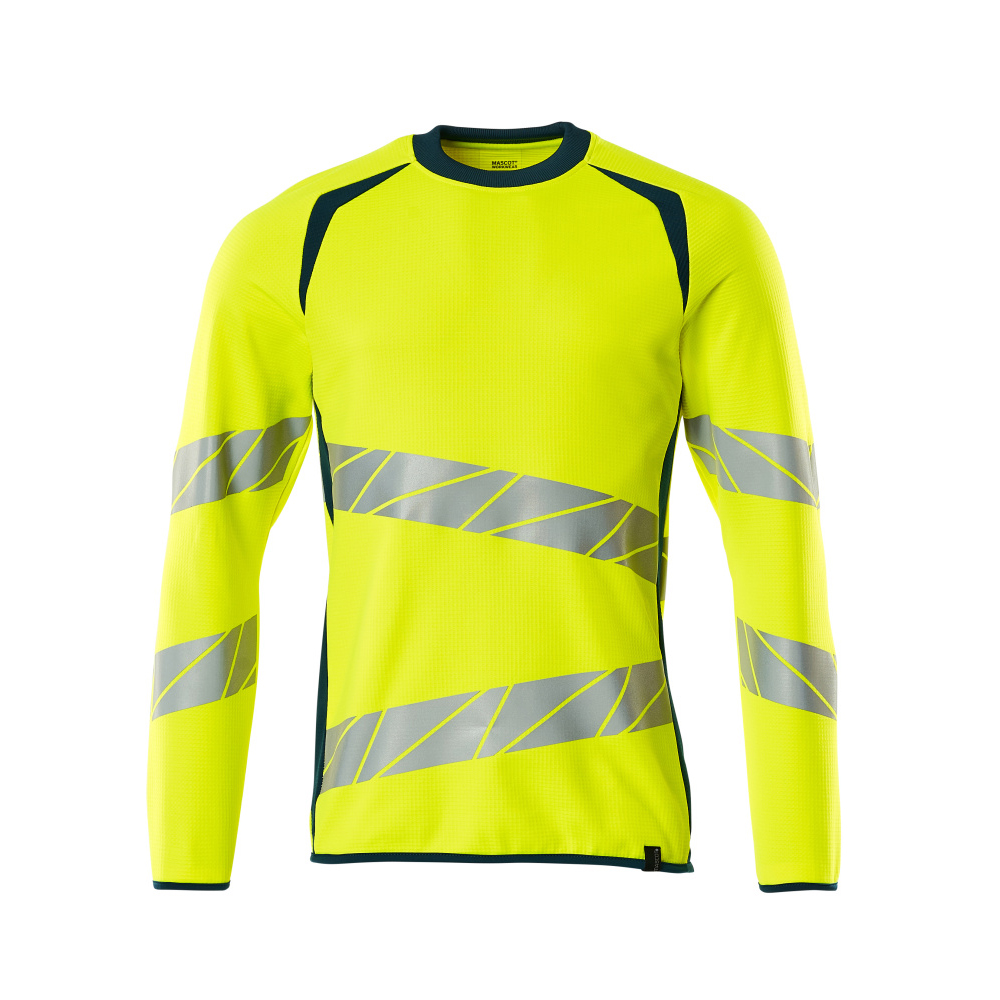Fluorescerande med sneda tvärgående reflexer. Tvåfärgat. Modern passform. Behaglig bomullsinsida och slitstark polyester med stretch på utsidan. Kvadratiskt jacquardmönster. Reflexen är elastisk. Rund hals. Ribbstickning i halsen. Kragbesättning. Nackband. Resår vid handleden och i nederkanten.