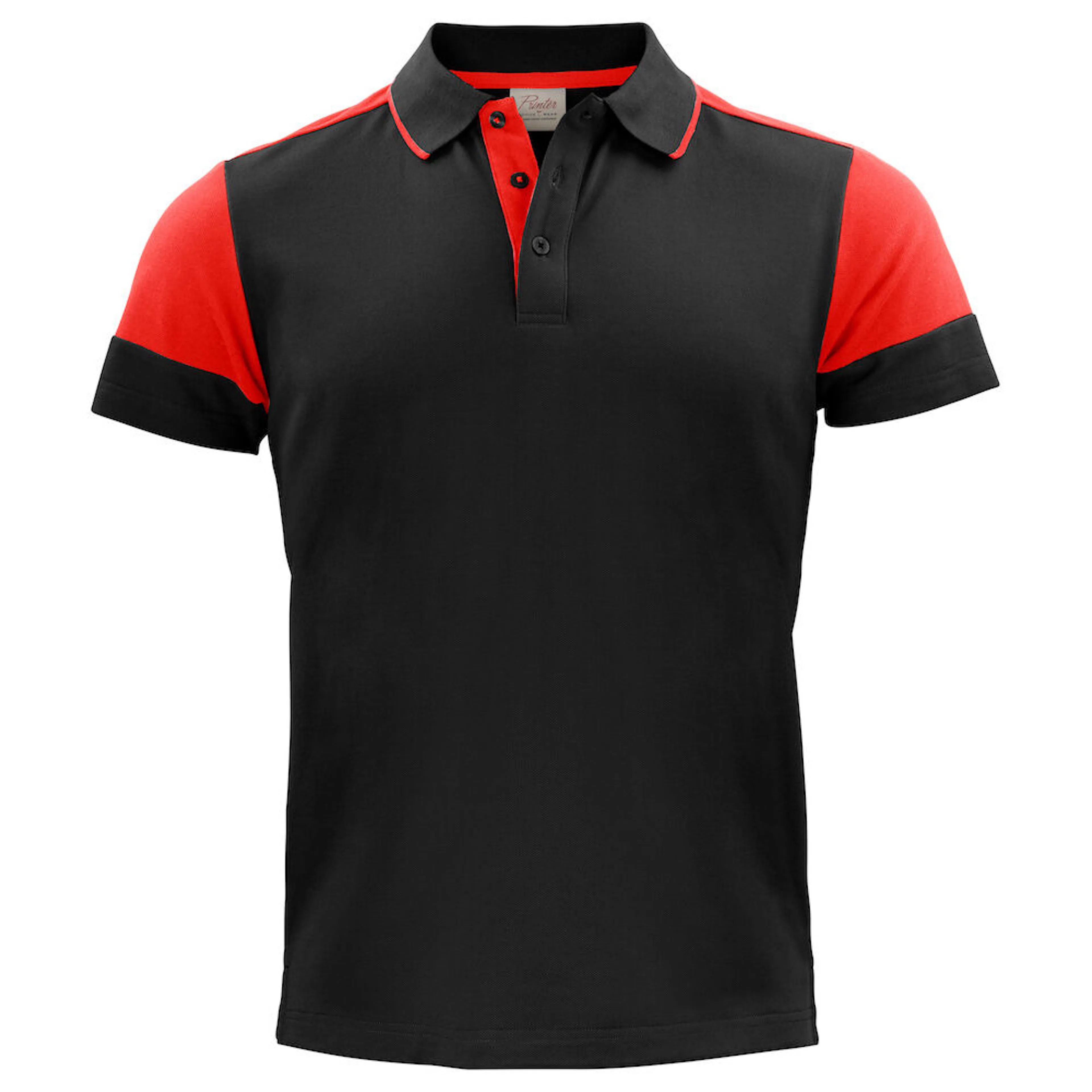 Tvåfärgad piké med 3 knappar och krage med kontrast. Kontrasttejp i nacken och på sidoslitsarna. Nacketiketten är avrivbar med separat storleksetikett. I vänster sidosöm finns en tvättchipficka. Oeko-Tex 100-certifierad och levereras i biobaserad, komposterbar påse.