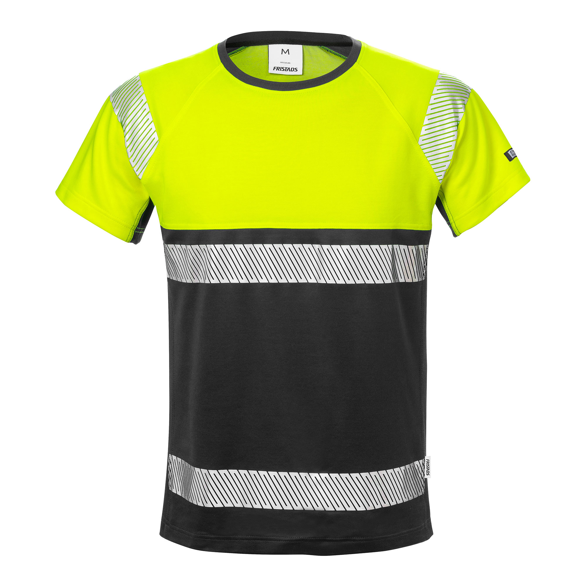 T-shirt för hög synbarhet från Fristads med stretch-reflexer för extra rörelsefrihet. Tillverkad i ett mjukt och bekvämt stretchmaterial med bomull på insidan. Transporterar fukt, torkar snabbt och har UV-skydd.