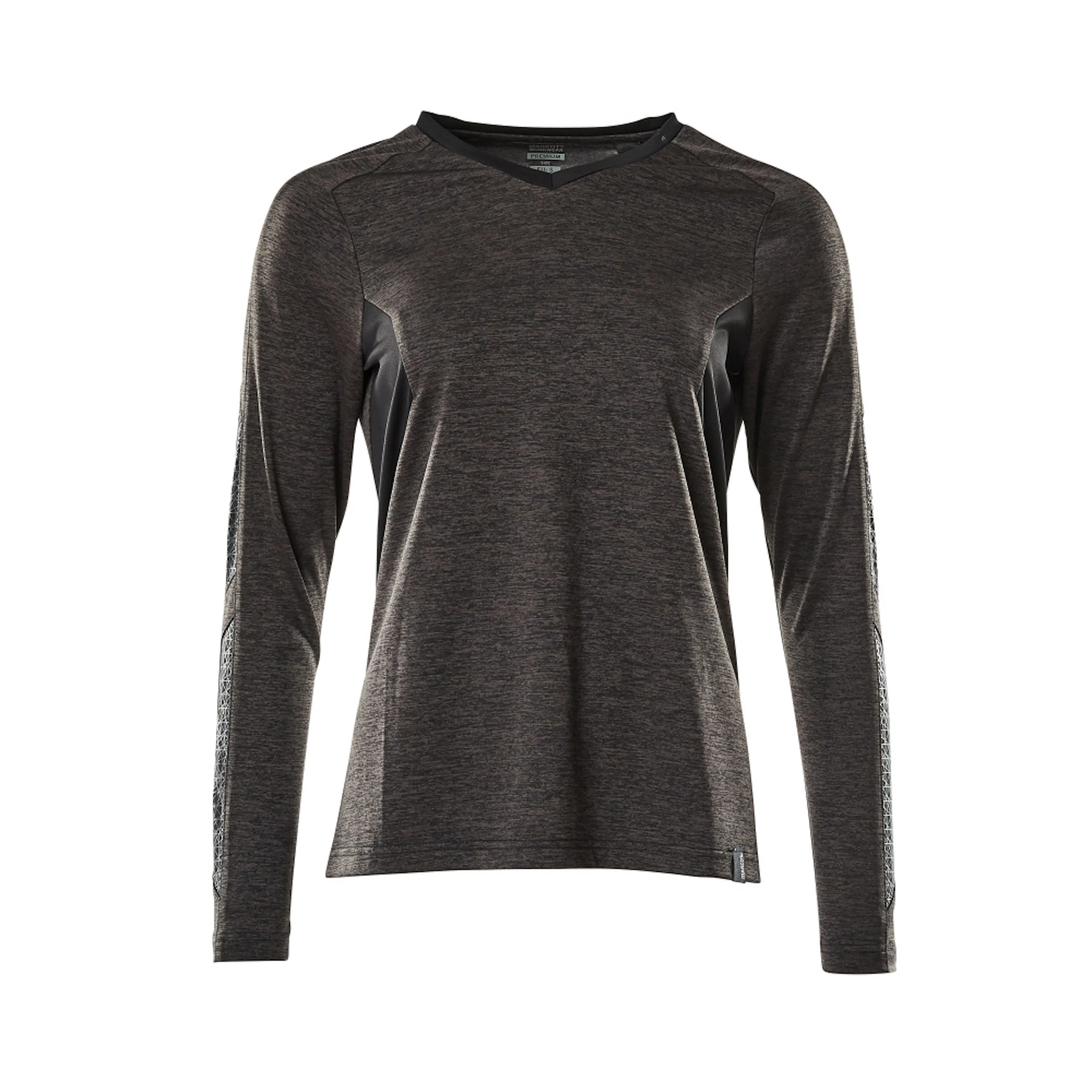 Lady passform. V-hals. Fukttransporterande och isolerande. Tryck på delar av plagget.