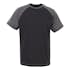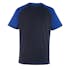 Tvåfärgat. Kammad bomull. Kraftig kvalitet. Förkrympt. Rund hals. Ribbstickning i halsen. Nackband. Slits i sidorna. Ryggen är förlängd. Kontrastsömmar.